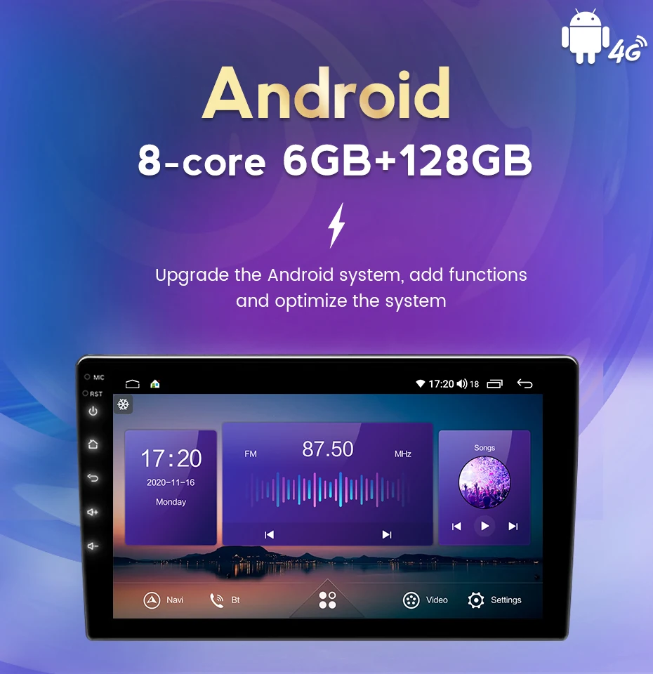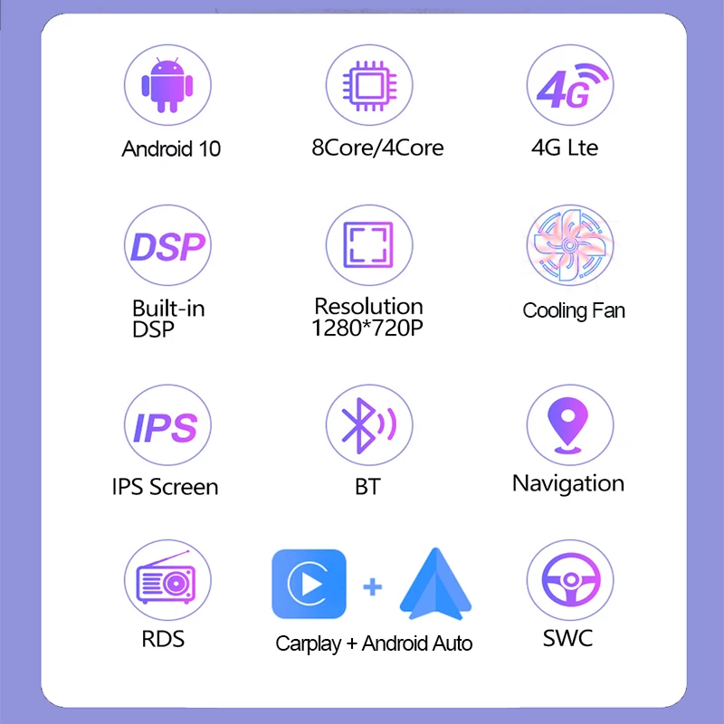 > Android 10,0 + API 29 + 9 дюймов IPS Экран + 1280*720 Разрешение + Octa Core + DDR4 4 Гб (6 Гб опционально) флэш-памяти + 64 Гб памяти (128 Гб опционально) + беспроводной Carplay + Android Авто + DSP + оптический выход + Коаксиальный выход + алюминиевый радиатор + Встроенный вентилятор + встроенный Wifi + 4G LTE + gps-навигация + управление рулевым колесом + Bluetooth BT5.0 + Встроенный микрофон + Поддержка USB ADAS DVR Функция + Европейская DAB функция + 2K Vedio Play