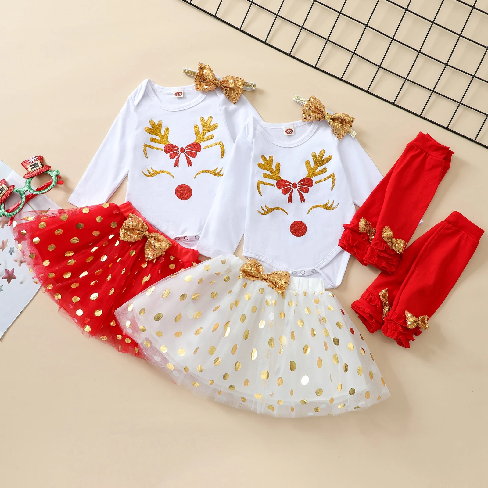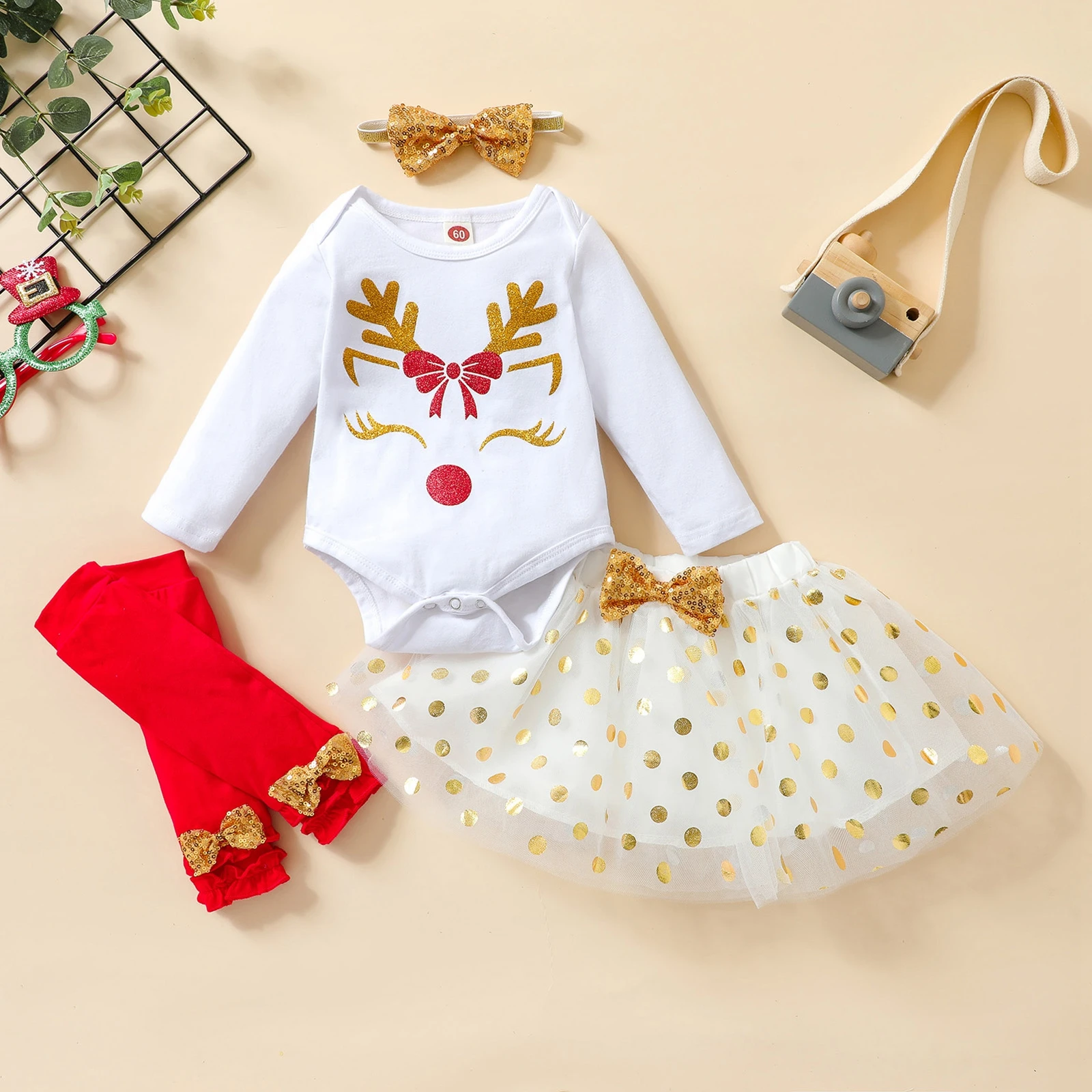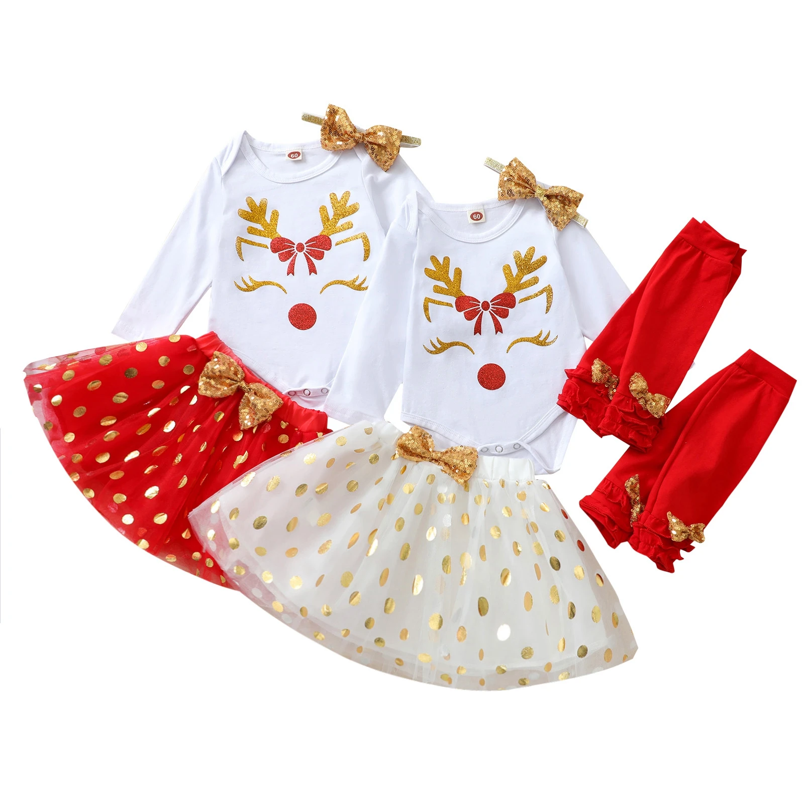 Рождественские наряды для малышей из 4 предметов комбинезон с длинными рукавами с оленем + юбка-пачка + гетры + повязка на голову для маленьких девочек