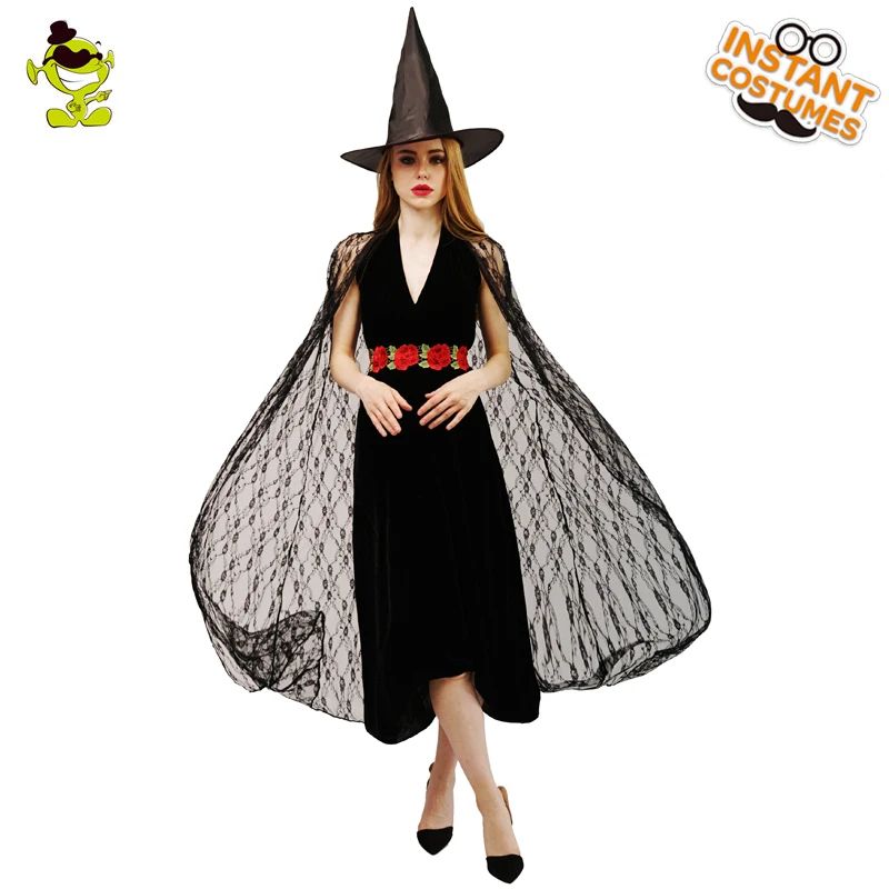 Маскарадное платье с черной ведьмой, одежда для вечеривечерние, представлений, костюм на Хэллоуин с розой, Женский костюм для косплея для взрослых и женщин