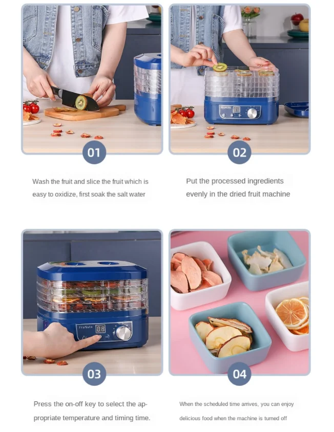 Добро пожаловать в оптовую продажу, консультация клиентов!10 часов таймера, энергосбережение и отключение звука.35-70 градусов регулируемая температура.Сухофрукты/ароматный чай/сушеное мясо/овощи/зерна/Домашние животные.Воздушные сушилки отделяют воду от пищи и поддерживают питательную ценность организма.Обычно температура контролируется между 35 и 70 градусами. Поддерживая низкую температуру и постоянную технологию контроля температуры, можно не только обеспечить питание витаминами и антоцианинами в пище.Печь нагревается, чтобы высушить приготовленную еду и разрушить питательные вещества, такие как витамины.Наименование: сушилка для пищевых продуктов.Материал: пищевой полипропиленНоминальная мощность: 250 ВтНоминальное напряжение: 220-240 В.Диапазон температур: 35-70 градусов Цельсия.Количество этажей: 5Шум: 35-50 дБРазмер:После поднятия: 230*245 ммПеред поднятием: 230*190 ммВремя: 0-10 часовХарактеристика:* Легкий и легко хранить,* Многофункциональные сухофрукты/чай/сушеное мясо/овощи/злаки/Домашние животные.* Пятислойная емкость может быть скорректирована по мере необходимости, может быть добавлен или удален по желанию, прост в использовании* 360 градусов сушка воздуха, технология циркуляции горячего воздуха, более эффективная* Энергосбережение* Механическое управление, ручная регулировка 35-70 градусов, подходит для различных компонентов при различных температурах,* Двойная защита, автоматически отключается при слишком высокой температуре, безопаснее* Съемный сетевой диск, легко чиститсяФрукты: 80 ° 10 часовОвощи: 70 ° 7 часовМясо: 60 ° 4 часа