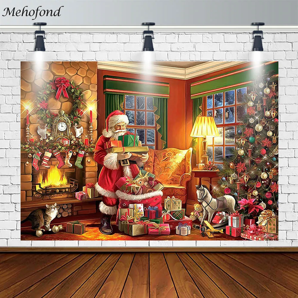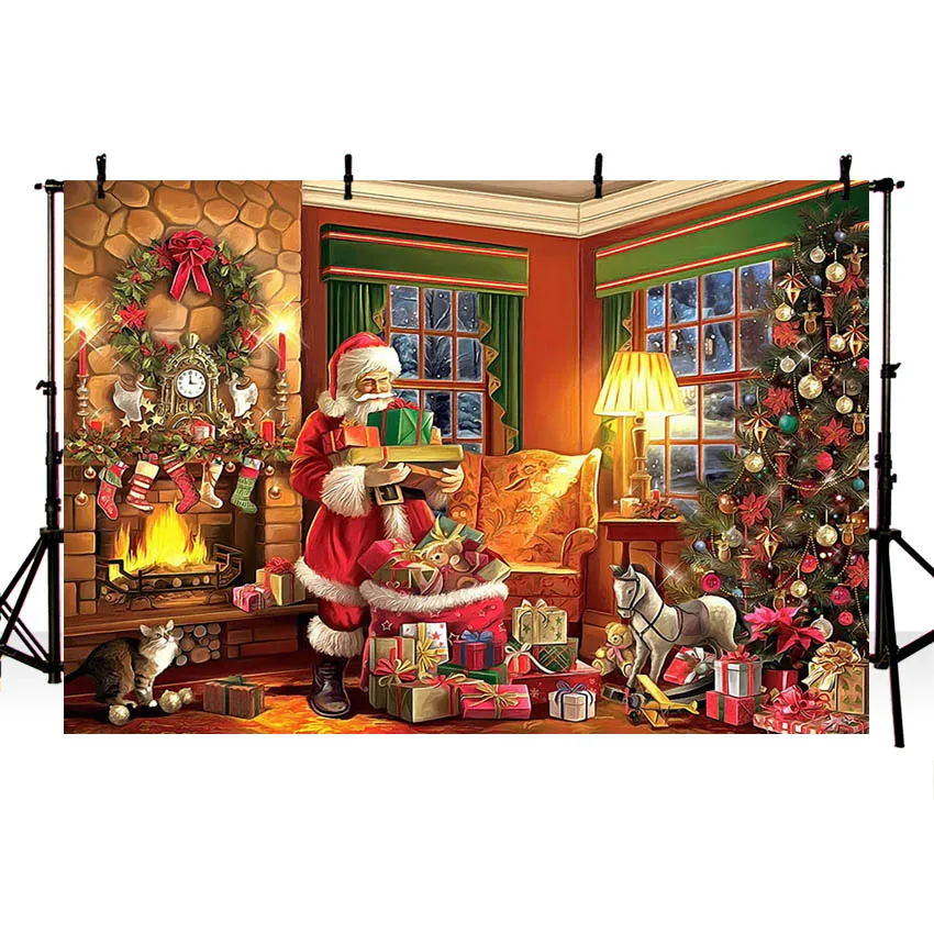 Фотозона для фотографирования с изображением рождественской елки Деда Мороза и камина