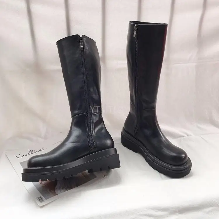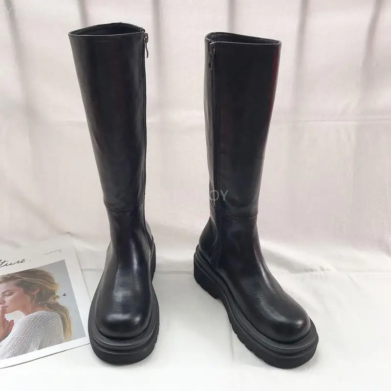 Женские кожаные сапоги до колена на платформе, осенне-зимние сапоги на молнии с круглым носком и квадратным каблуком, 2022