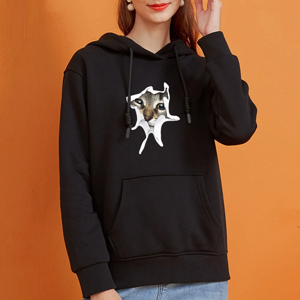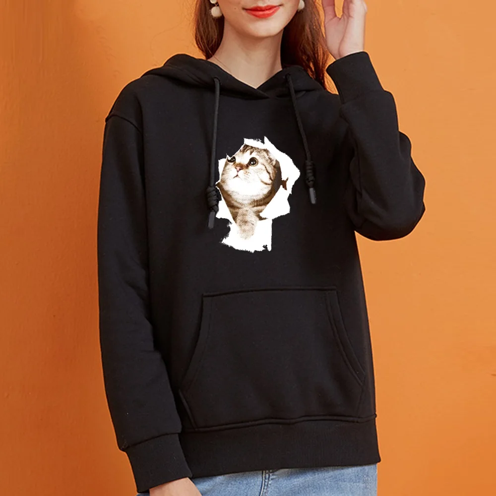 Толстовка с капюшоном, милый топ с принтом кота, теплый пуловер с д...