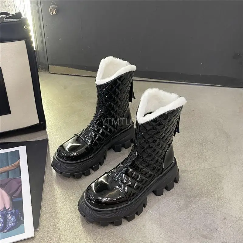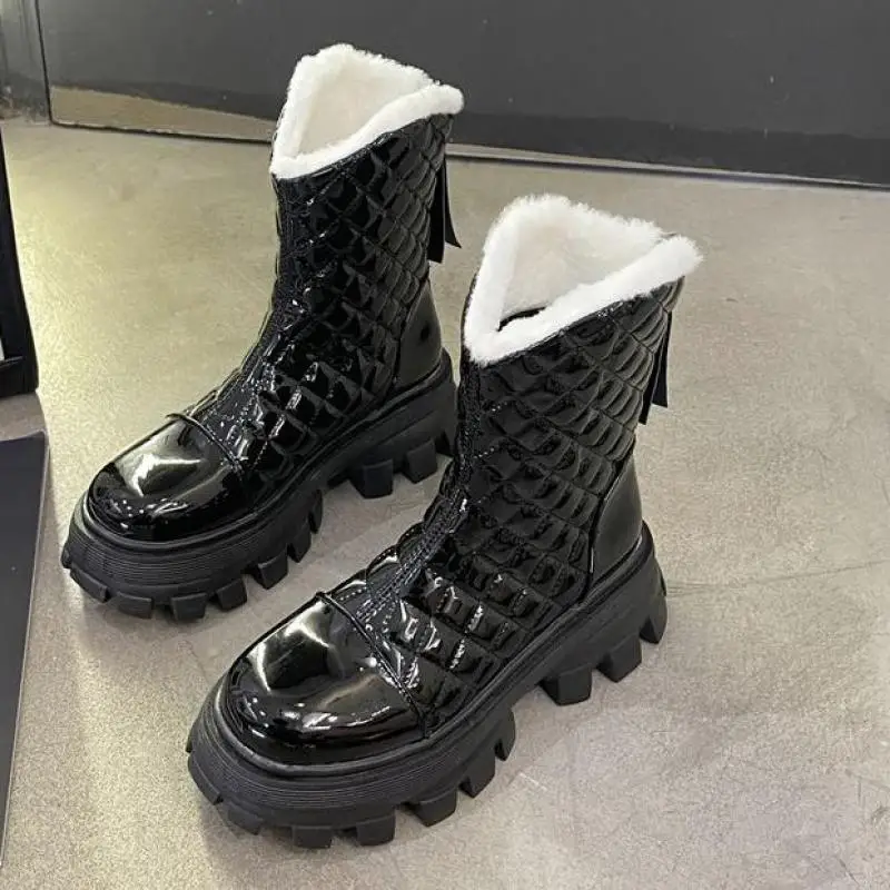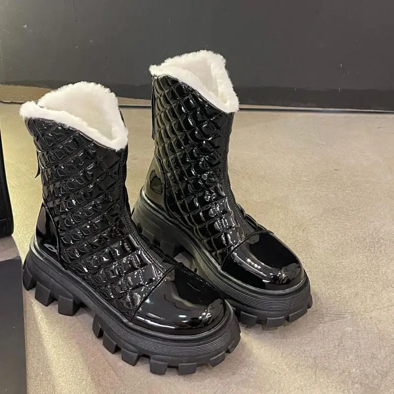 Зимние плюшевые сапоги до колена, женские черные кожаные боевые сап...