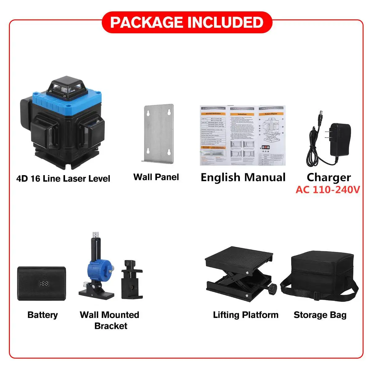 Посылка включает 1:1 лазерный уровень (опция)1x Мощность Кабель-адаптер1 подъемная платформа1x аккумулятор 5800 мач1 настенный кронштейн1x настенная железная пластина1x руководство на английском языке