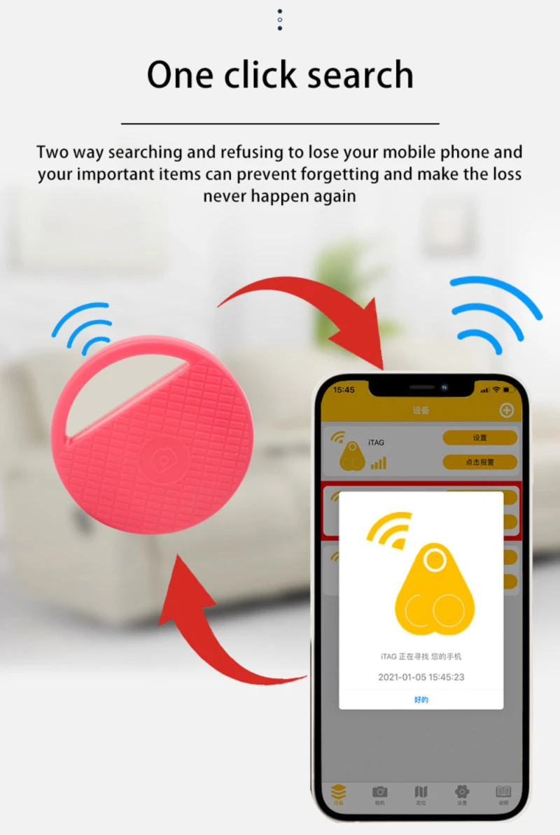 1. Функция поиска объекта: привяжите устройство против потери к ценным вещам. Когда устройство подключено к приложению Bluetooth мобильный телефон, используйте функцию поиска приложения, чтобы устройство не потеряло звук, чтобы найти предметы.