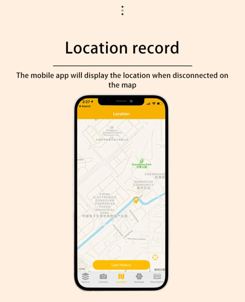 6. Место разъединения: когда элемент отключен от мобильного приложения Bluetooth, приложение будет записывать потерю позиции элемента после разъединения, И потерянное положение после отключения будет отображаться на карте в приложении.