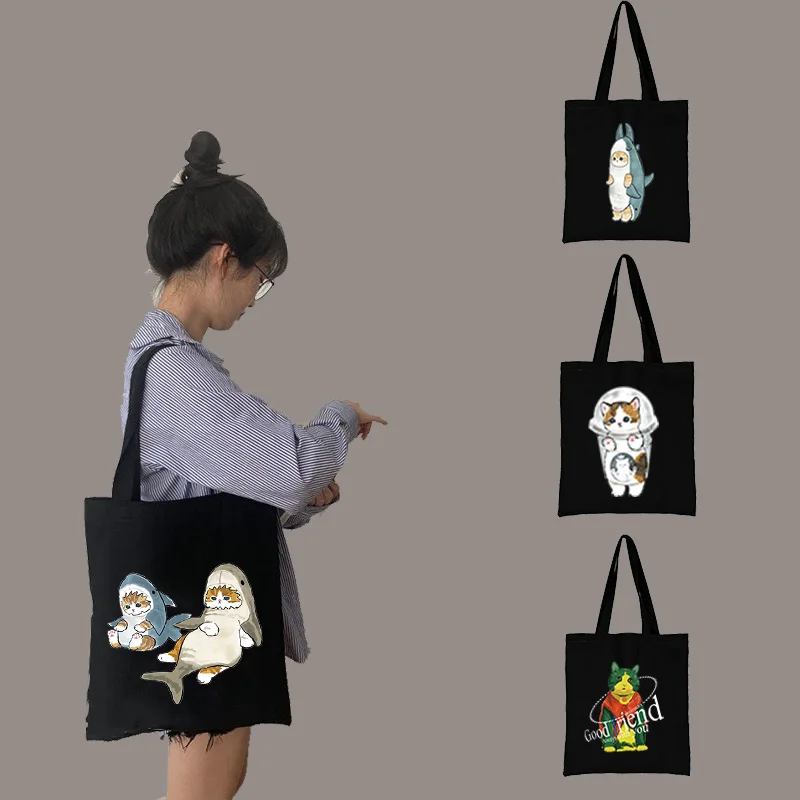 Сумка для покупок с рисунком кошки, многоразовая Аниме Сумка-тоут, большая холщовая женская сумка, шоппер, Студенческая Холщовая Сумка на ремне