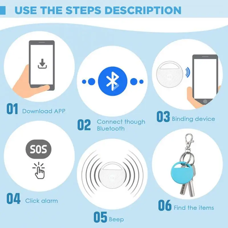 1. Функция поиска объекта: связать устройство против потери с ценностями. Когда устройство подключено к приложению Bluetooth на мобильный телефон, используйте функцию поиска приложения, чтобы сделать звук устройства против потери, чтобы найти элементы.