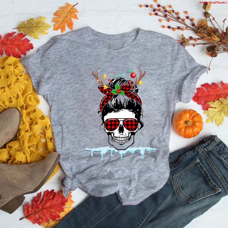Женская футболка с принтом черепа, шапки Санты, оленя, Рождественский принт, футболка в стиле Харадзюку, футболка в эстетическом стиле, Забавные футболки, женская футболка, женская одежда