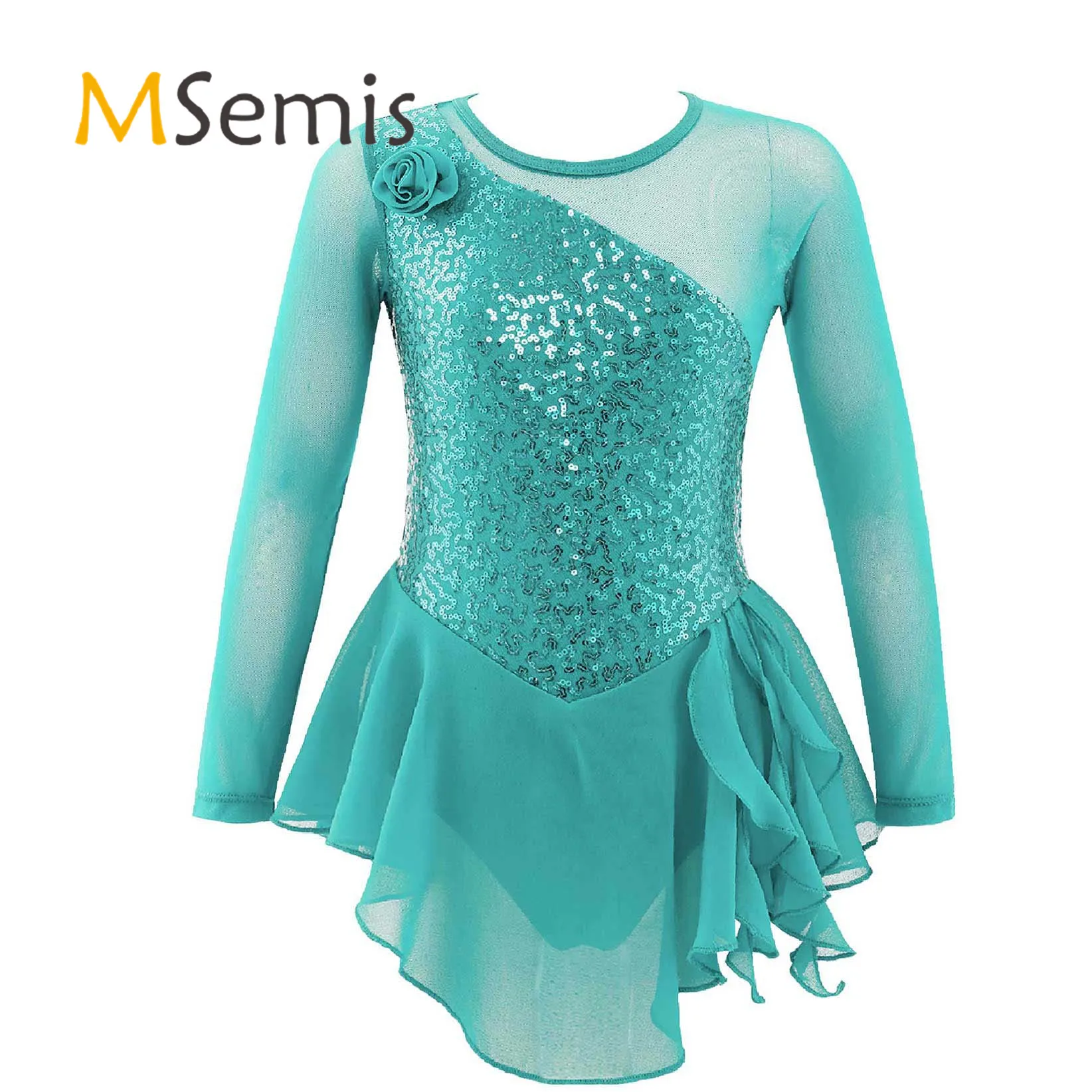 Детское балетное трико для девочек, танцевальное платье с длинным рукавом и круглым вырезом, платье для катания на коньках