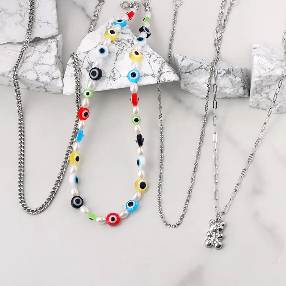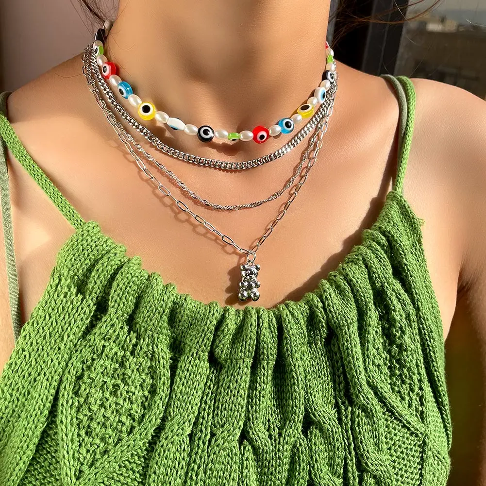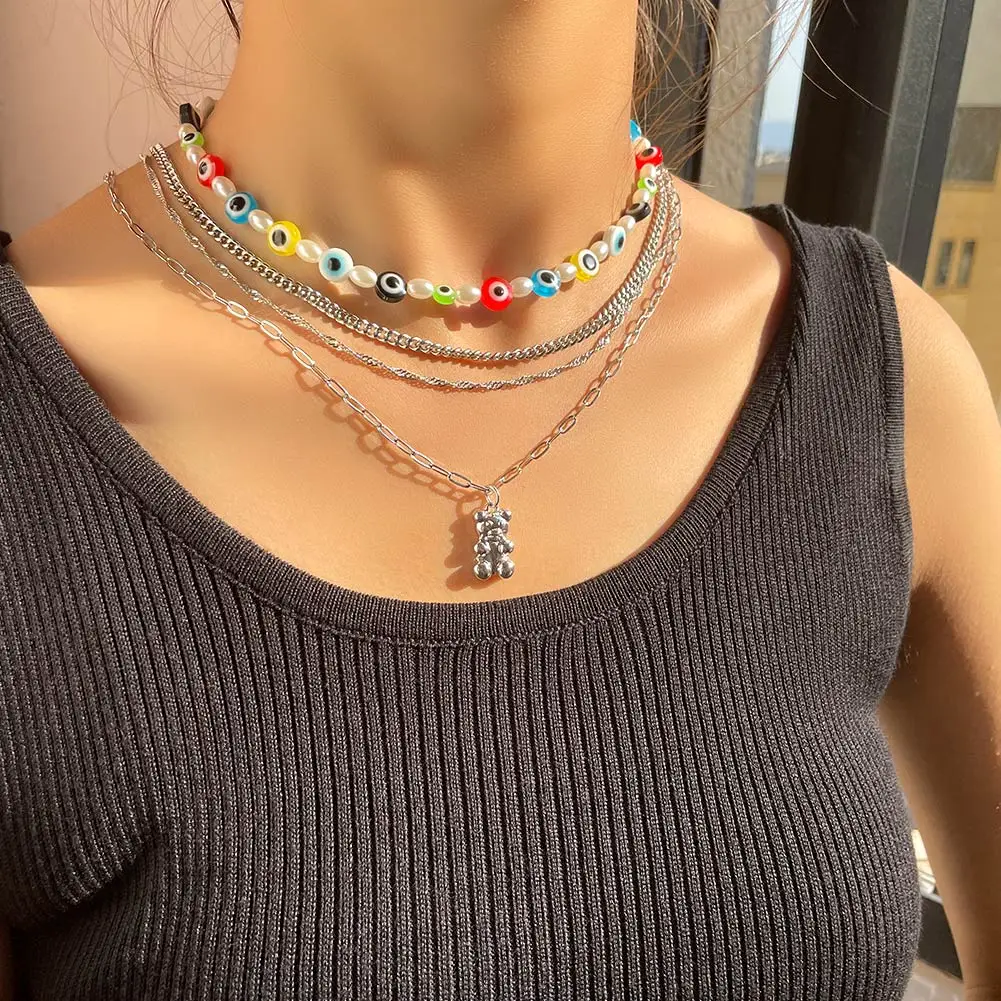 Новинка, стеклянные бусины радужного цвета, жемчужное ожерелье с бисером сглаза для женщин, металлическое ожерелье с подвеской в виде медведя золотого и серебряного цвета, ювелирные изделия