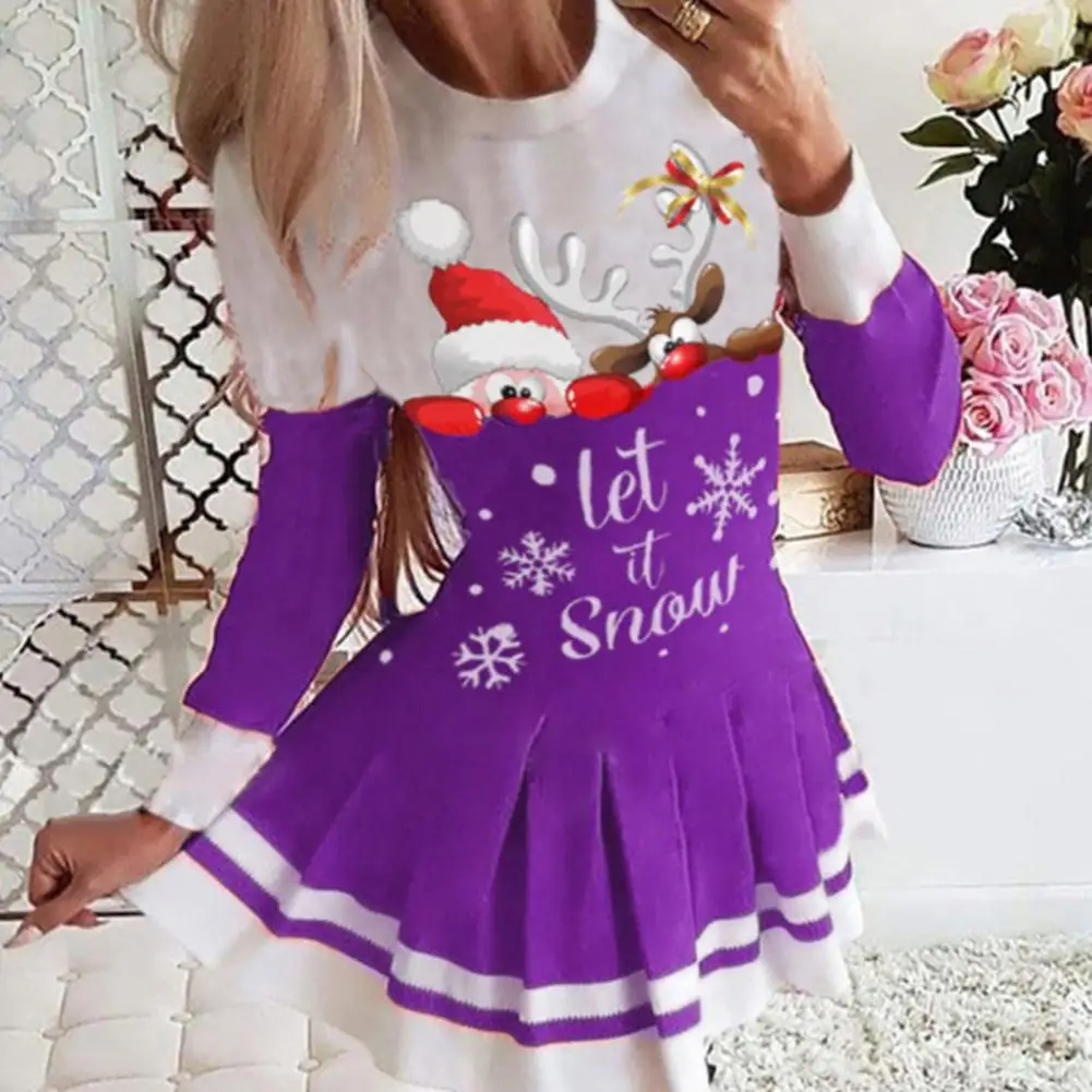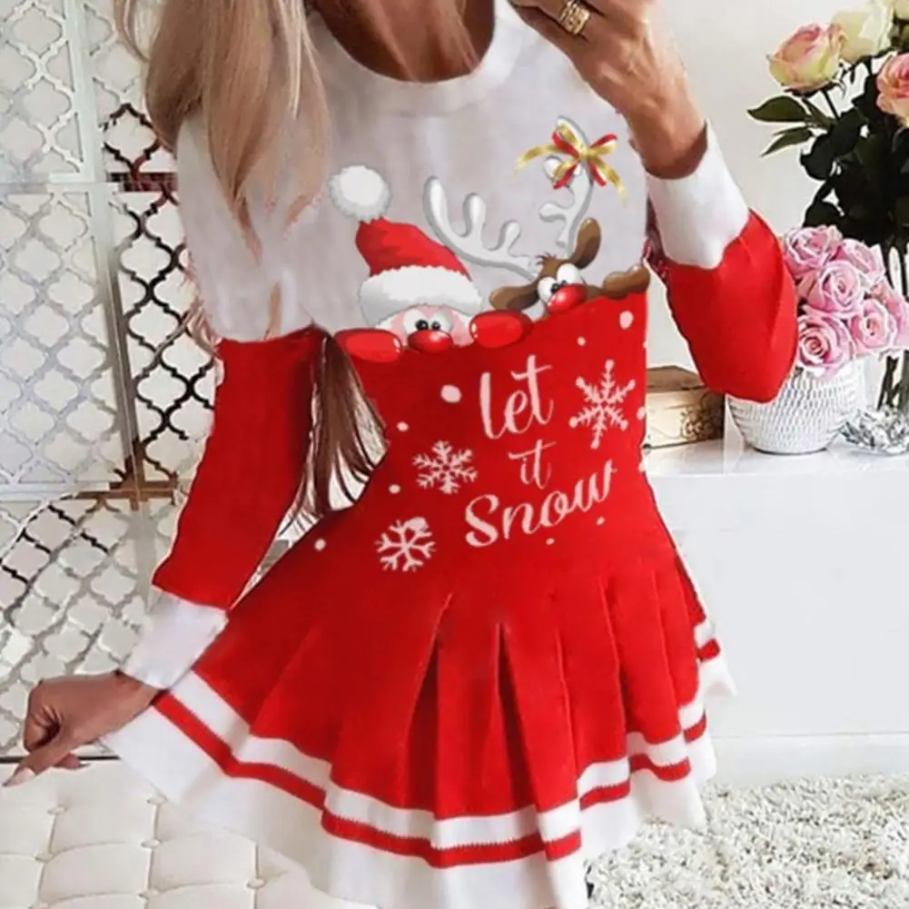Рождественское платье, плиссированное праздничное лоскутное мини-платье с круглым вырезом и принтом оленя на новый год