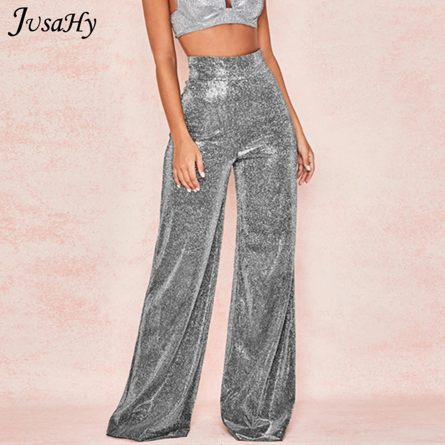 Женские блестящие широкие брюки, серебристые свободные брюки с высо...