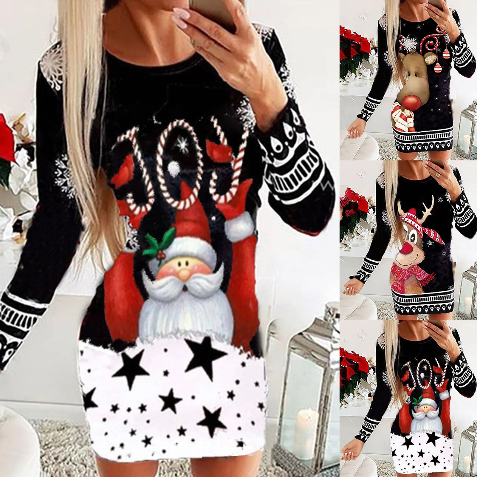 Новое рождественское женское платье, зимнее повседневное пикантное платье с длинным рукавом, топы с принтом Санта-Клауса, лося, женское платье