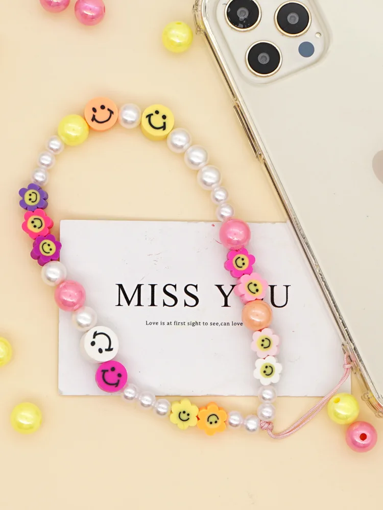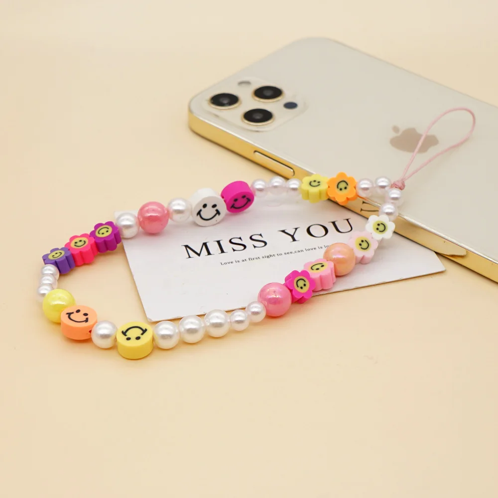 Тип товара: мобильный телефон с ремешкомМатериал: искусственный жемчуг + акриловые бусины + мягкая керамика улыбающееся лицо
