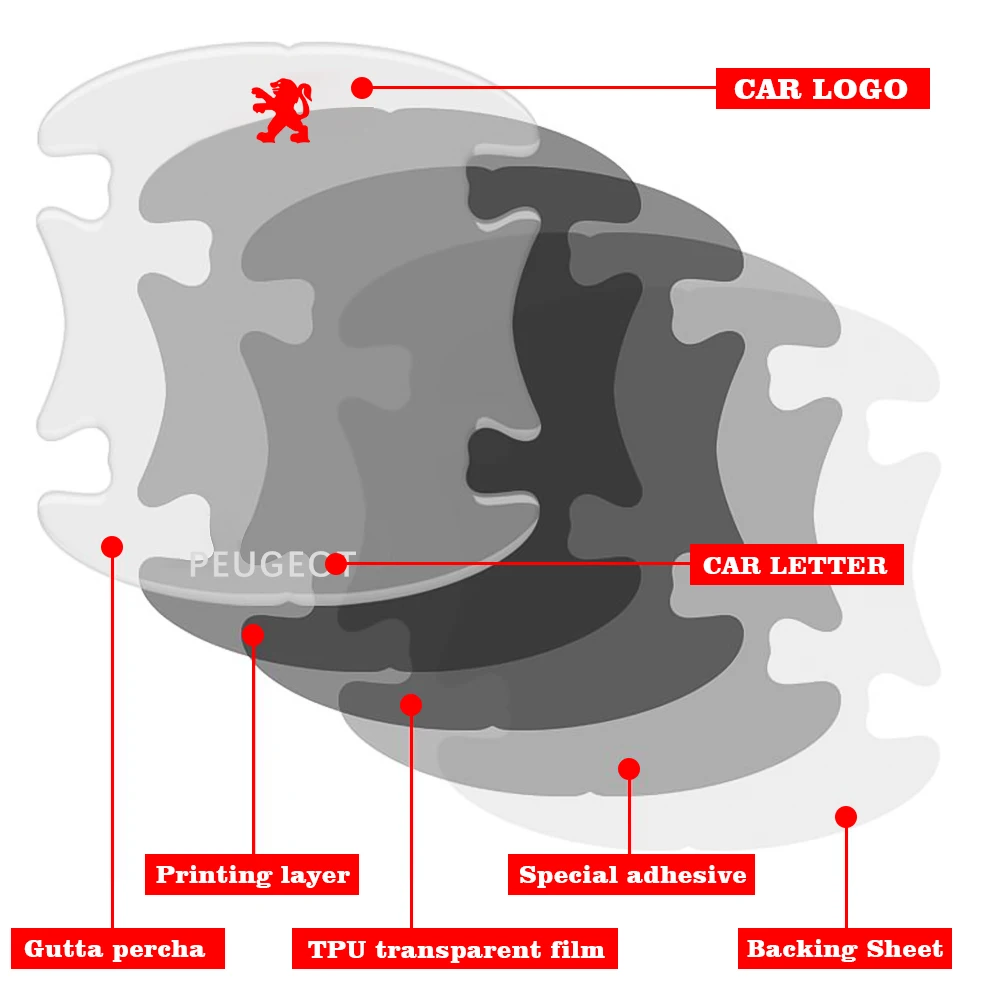 4 шт. Автомобильная дверная ручка, защитная пленка, наклейка, декоративные наклейки, аксессуары для Peugeot 107 108 206 407 408 5008 2008 3008 208