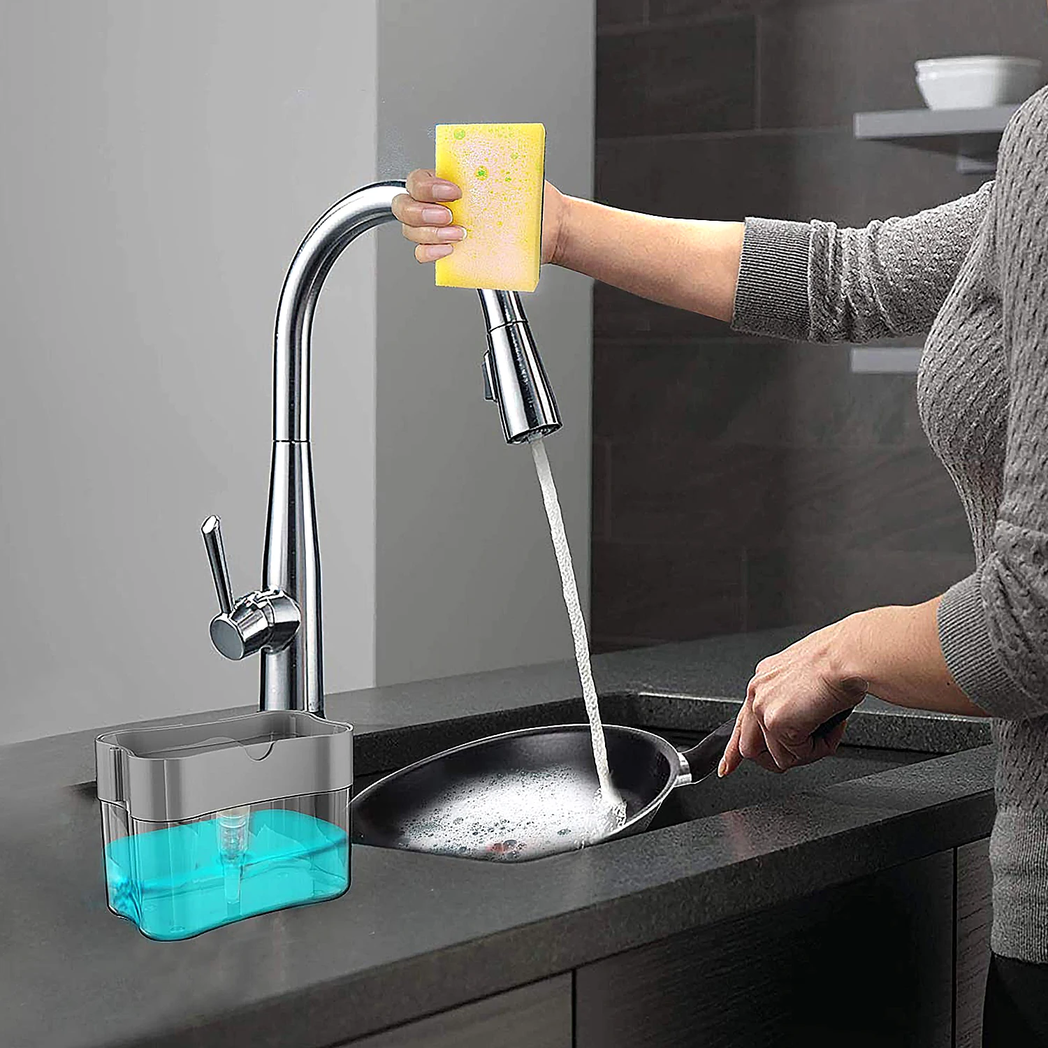 Особенности:1,2 в 1 дизайн: диспенсер для мыла и caddy, управление одной рукой. Диспенсер для раковины с прикрепленным caddy, вы можете использовать его для хранения губки, скрубберов, тряпок, чистящих подушечек в одном удобном месте, сохраняя воду от кухонных прилавков.2. Точное дозирование: Аккуратно нажмите на верхнюю пластину, чтобы распределить мыло непосредственно на губку. Оно допустит идеальное количество мыла для посуды на губке.3. Большая емкость: держатель губки для мыла имеет емкость 380 мл, не нужно часто его заправлять.4. Использование: Идеально подходит для дома, школы, офиса, больницы, отеля, ресторана и так далее.5. Простота в использовании: Используйте прилагаемую губку, чтобы надавить на насос, который распределяет идеальное количество мыла на губку.6. Подходящее мыло: подходит для всех видов жидкого мыла.7. Занимает небольшое пространство: компактный дизайн, вы можете положить его на кухонную столешницу, не занимая много места.