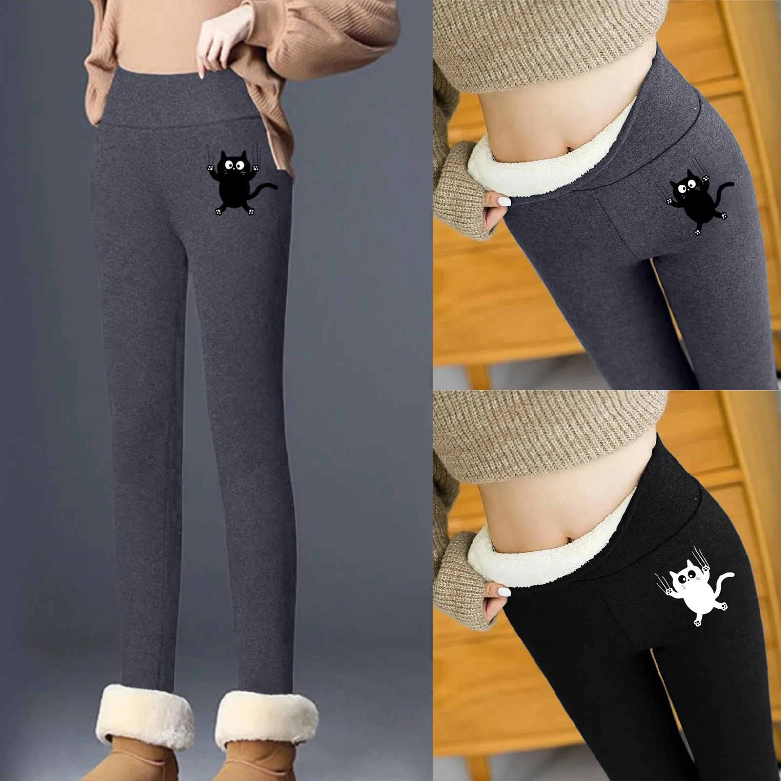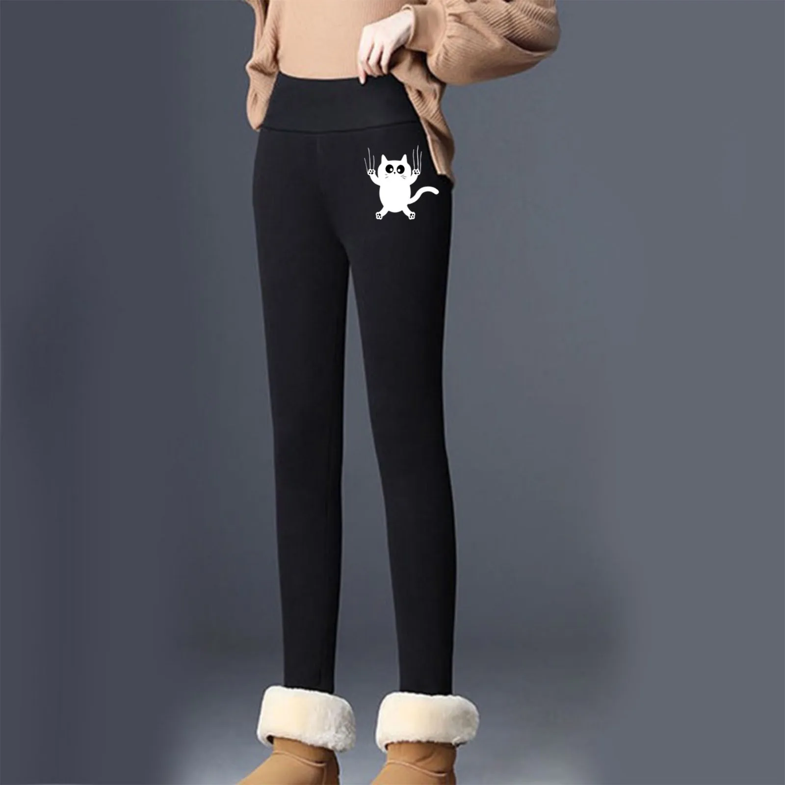 Женские осенне-зимние однотонные брюки с принтом кошек для тренировок дома теплые плюшевые брюки с эластичным поясом леггинсы