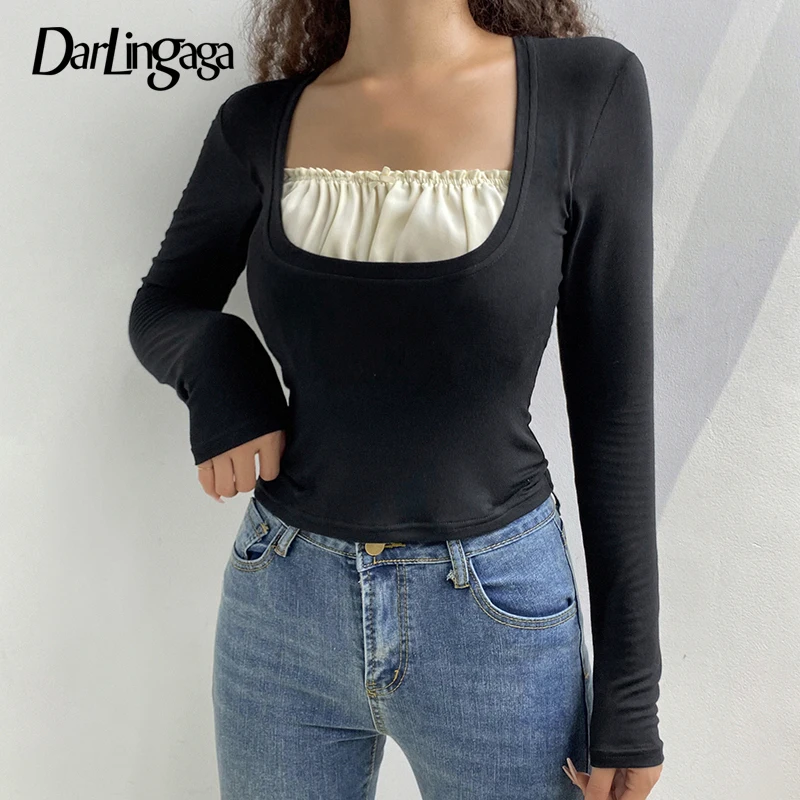 Повседневные облегающие черные футболки Darlingaga в стиле пэчворк с длинным рукавом Женские базовые Топы с бантом и рюшами футболки укороченная Осенняя футболка в Корейском стиле новинка