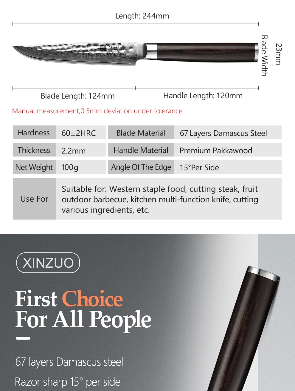 XINZUO 5-дюймовый нож для стейка, дамасский резец, острые искусственные ножи, шеф-повар, режущий кухонный инструмент, столовая посуда