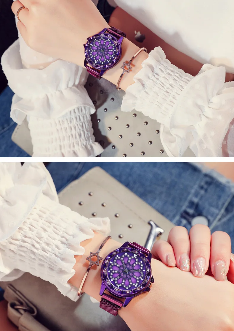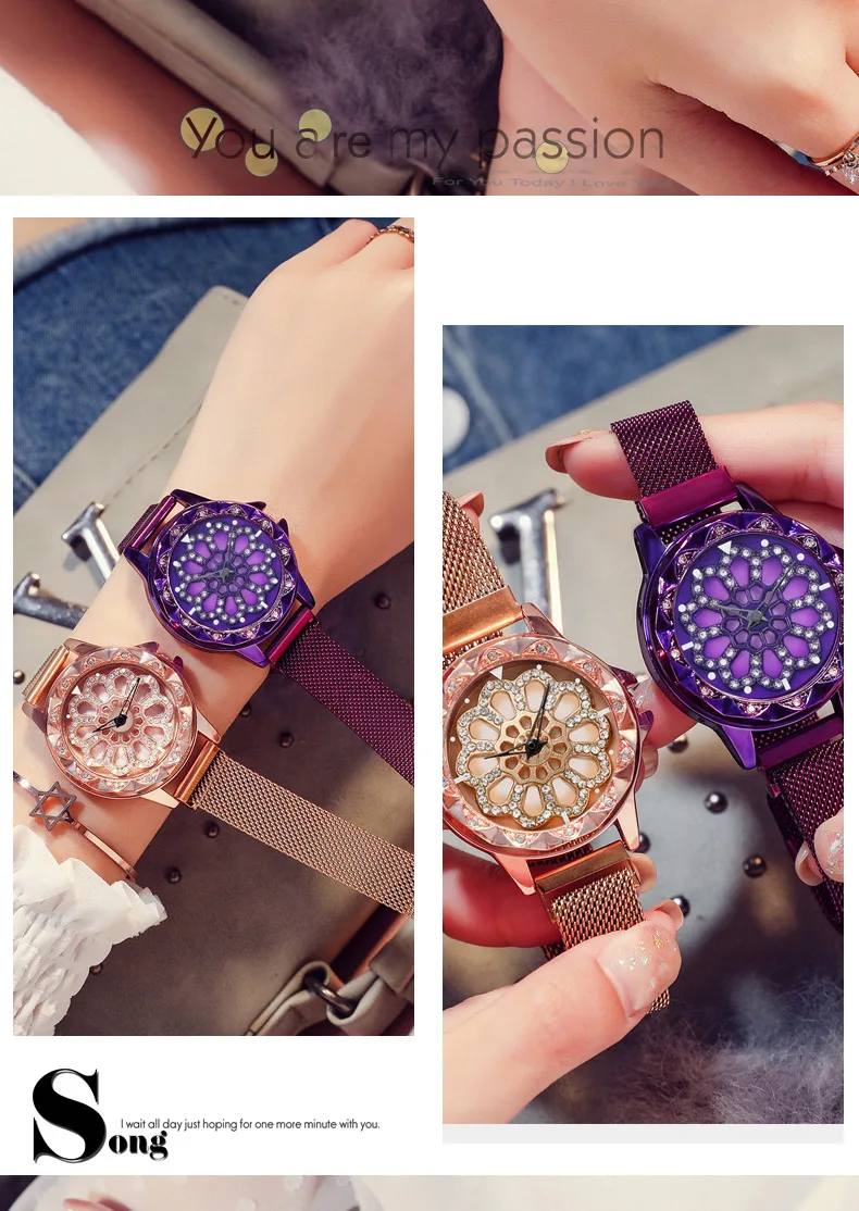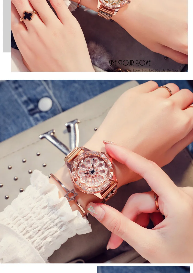 Роскошные женские часы на удачу с браслетом, часы из розового золота 2019 пробы с вращающимся цветком, модные женские кварцевые наручные часы со стразами и кристаллами на магнитной застежке