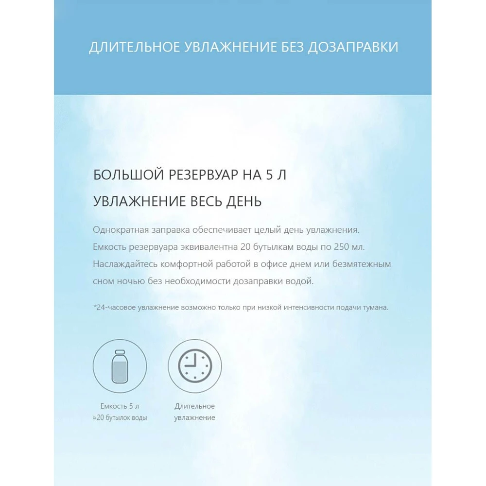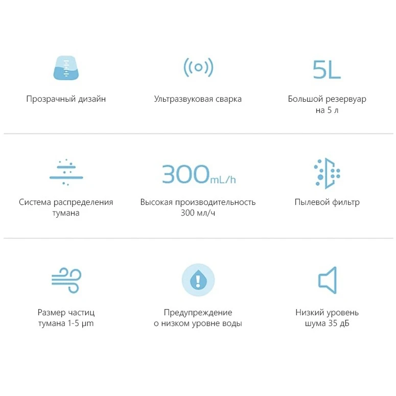 Прозрачный дизайн. Ультразвуковая сварка. Напоминание об отсутствии воды. Напряжение 220В 50Гц. Мощность 25Вт. Ёмкость 5л. Размеры 220х220х285мм. Производительность 300мл/ч. Пылевой фильтр. Система распределения тумана. Низкий уровень шума до 35дБ.