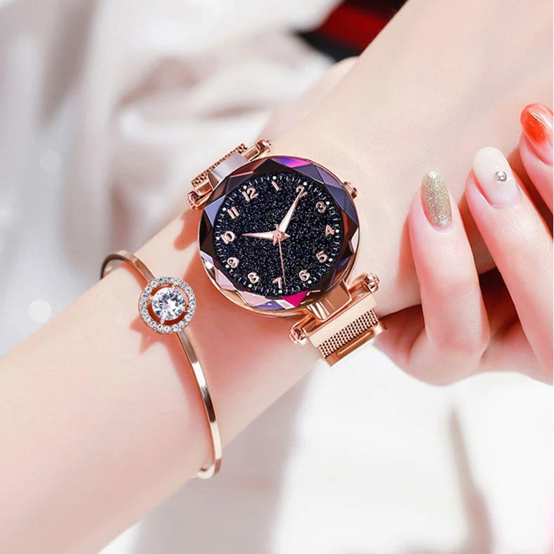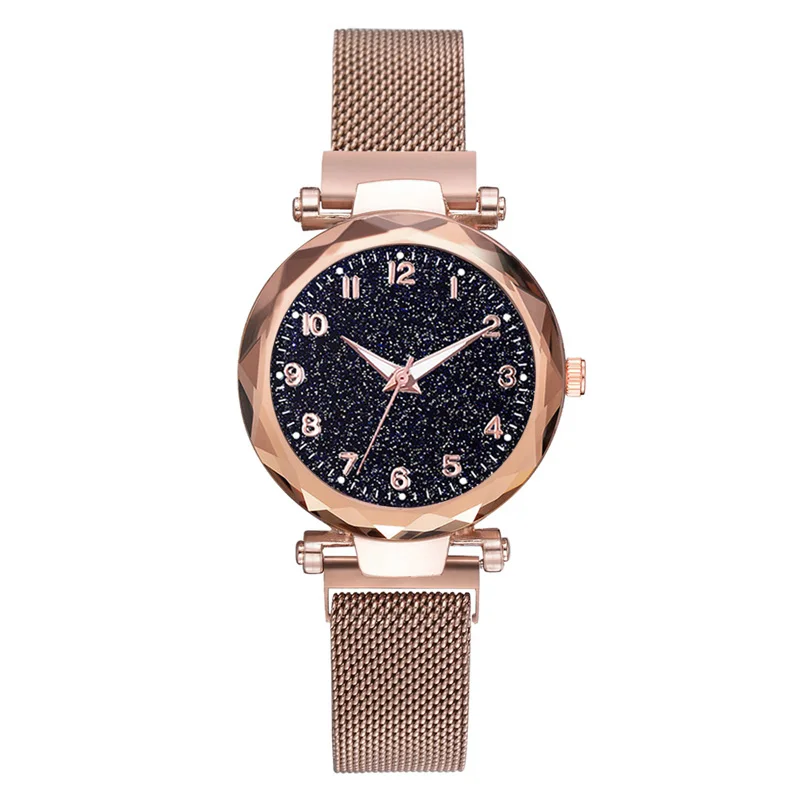 Часы наручные женские с магнитной застежкой, люксовые модные водонепроницаемые простые, с браслетом под розовое золото, с рисунком звездного неба, в минималистском стиле