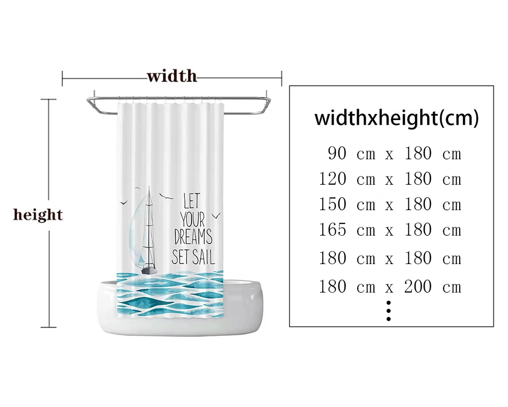 Узор: занавески для душа парусникаМатериал штор: полиэстерХарактеристики: водонепроницаемый, мягкий и прочныйИспользование: украшение для дома и отеляПосылка включает в себя:1 занавеска для душа + 12 пластиковых крючков Очень мягкая ткань высокой плотности, удобная, Экологичная, хорошая вентиляция.