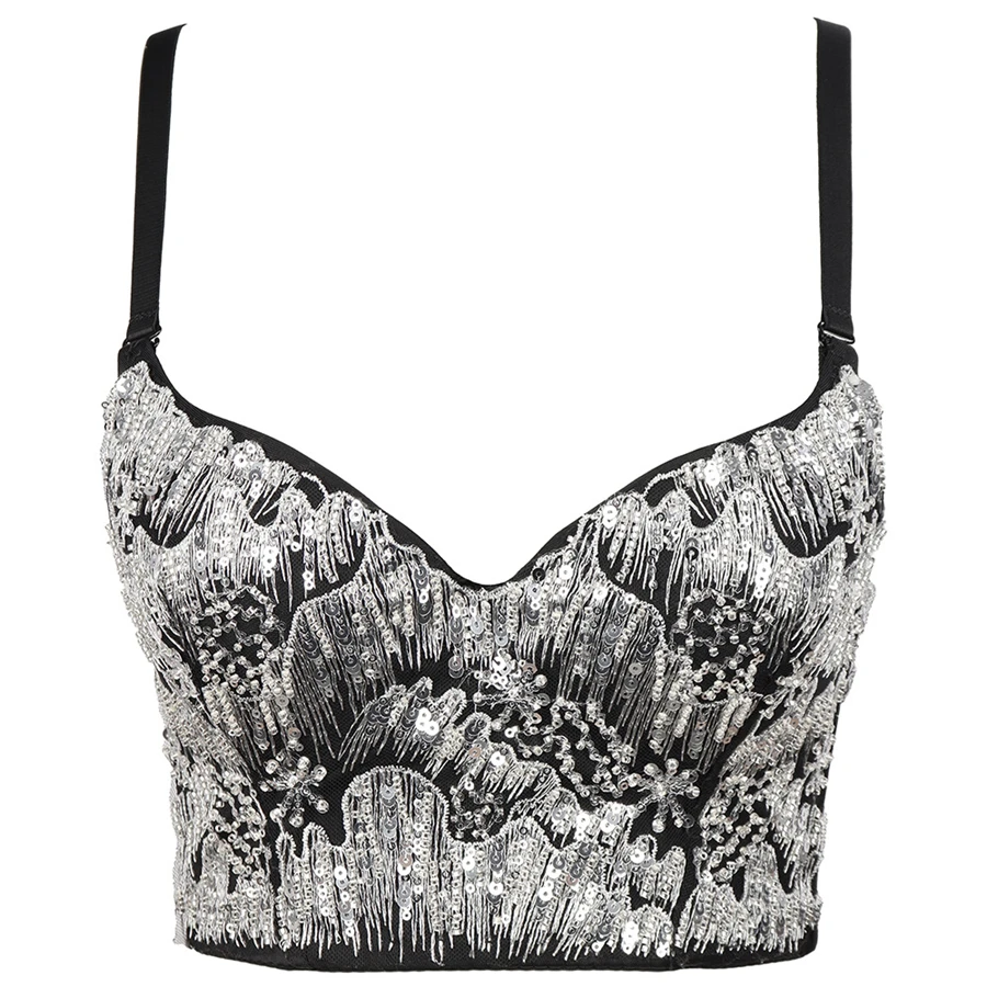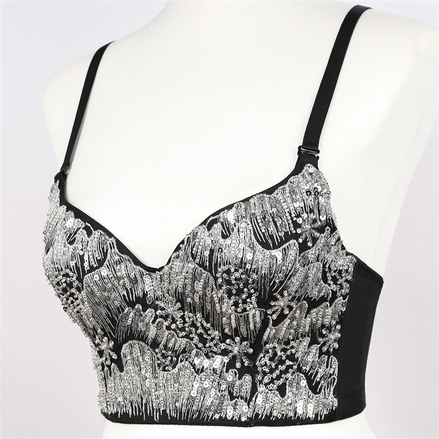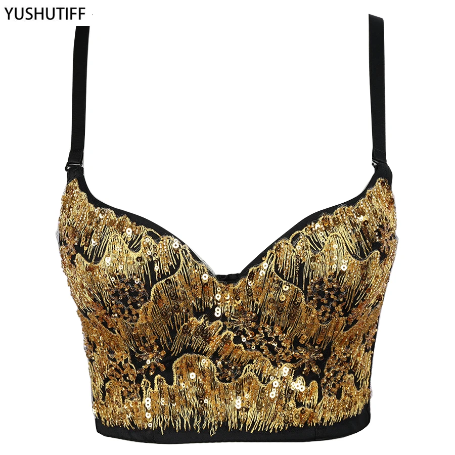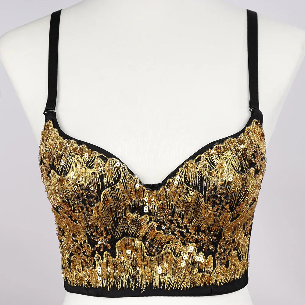 Новый укороченный со встроенным бюстгальтером с золотыми блестками для вечерние, ночного клуба, популярный сексуальный женский укороченный топ, женские корсеты на бретелях-спагетти, бюстье