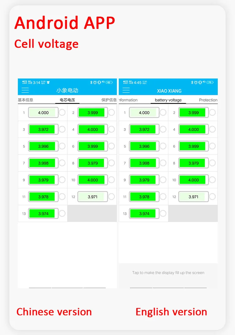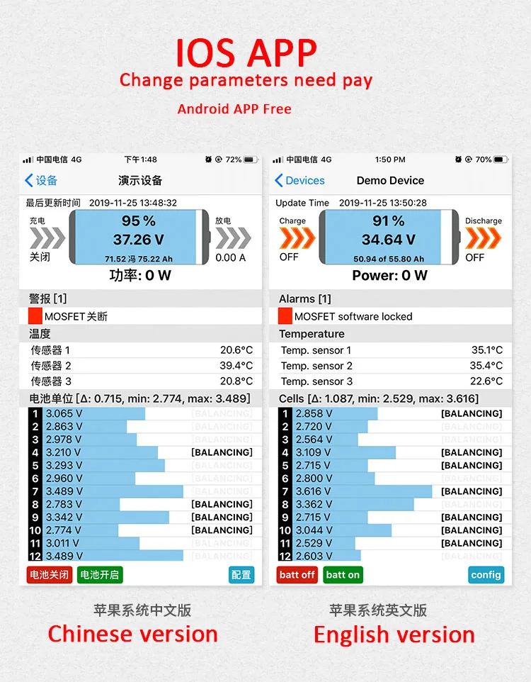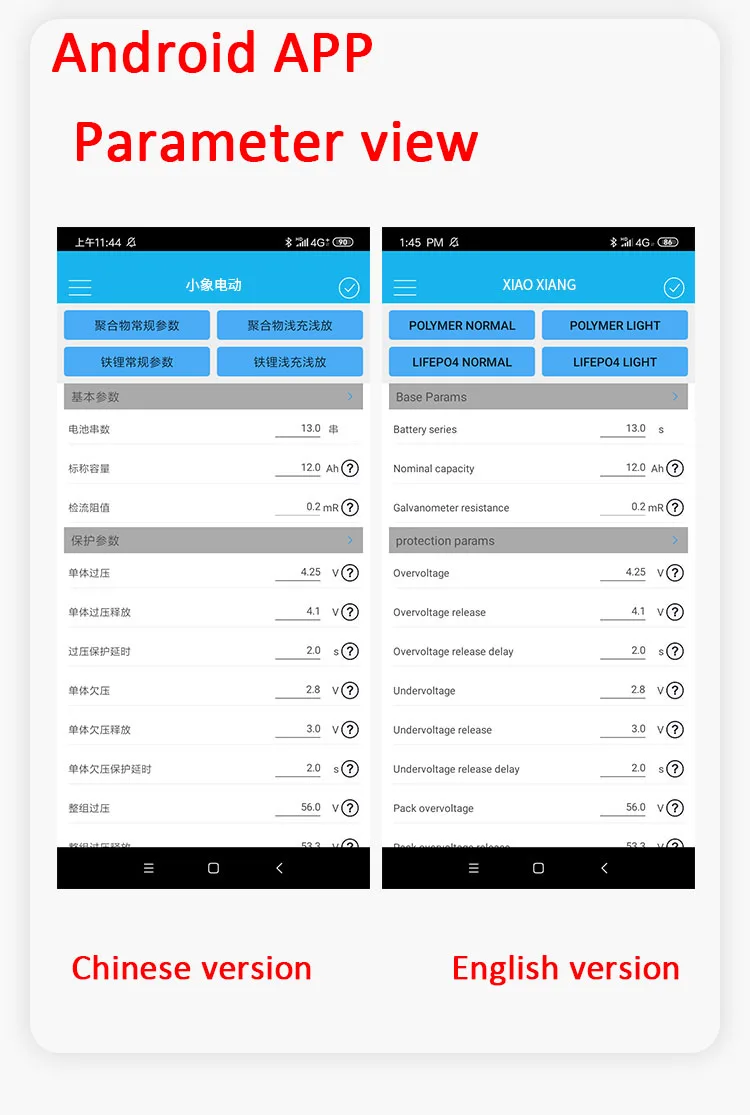 1. Приложение для мобильного телефона контролирует состояние зарядки и разрядки аккумулятора. Один аккумулятор перенапряжения и низковольтного напряжения, Аккумуляторный блок перенапряжения и низковольтного напряжения, балансового напряжения, высокой и низкой температуры, и значение релиза можно отрегулировать.