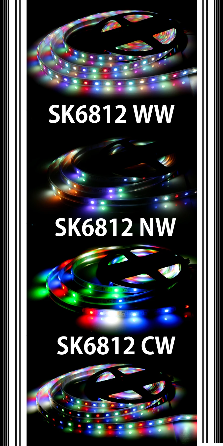 Светодиодный источник: 5050SMD RGBW встроенный микросхема SK6812Напряжение (постоянный ток):5 ВМощность:60 светодиодов/метр --------- 18 Вт/м30 светодиодов/метр --------- 9 Вт/м144 светодиодов/метрТип светодиодный: SMD5050Тип ИС: SK6812Светодиодный/на метр: 30, 60 светодиодный s/метр (Каждый светодиодный Светодиодный индикатор управляется отдельно)IC/на метр: 30, 60IC/метр (1 IC дисков 1 led чип)Пиксели/на метр: 30, 60 пикселей/метрСерый класс: 256Цвет: RGBW (WW 2700-3000K ; CW 6000-6500KЦвет печатной платы: черный/белыйКласс водонепроницаемости: IP30-----NON-водонепроницаемыйIP65 ----- водонепроницаемыйIP67 ----- силиконовая трубкаIP30 и IP65 есть пленкой длиной 3 м клейкая лента на задней стороне. Вы можете легко установитьПрименение:Подходит для украшения автомобиля и велосипеда, пограничного или контурного освещенияШироко используется для украшения дома, отелей, клубов, торговых центровАрхитектурное декоративное освещение, изысканное атмосферное освещениеШироко применяется при заднем освещении, скрытом освещении, освещении с буквенным каналомАварийное и безопасное освещение, рекламный знак освещенияДекоративные светильники для праздника, события, выставки