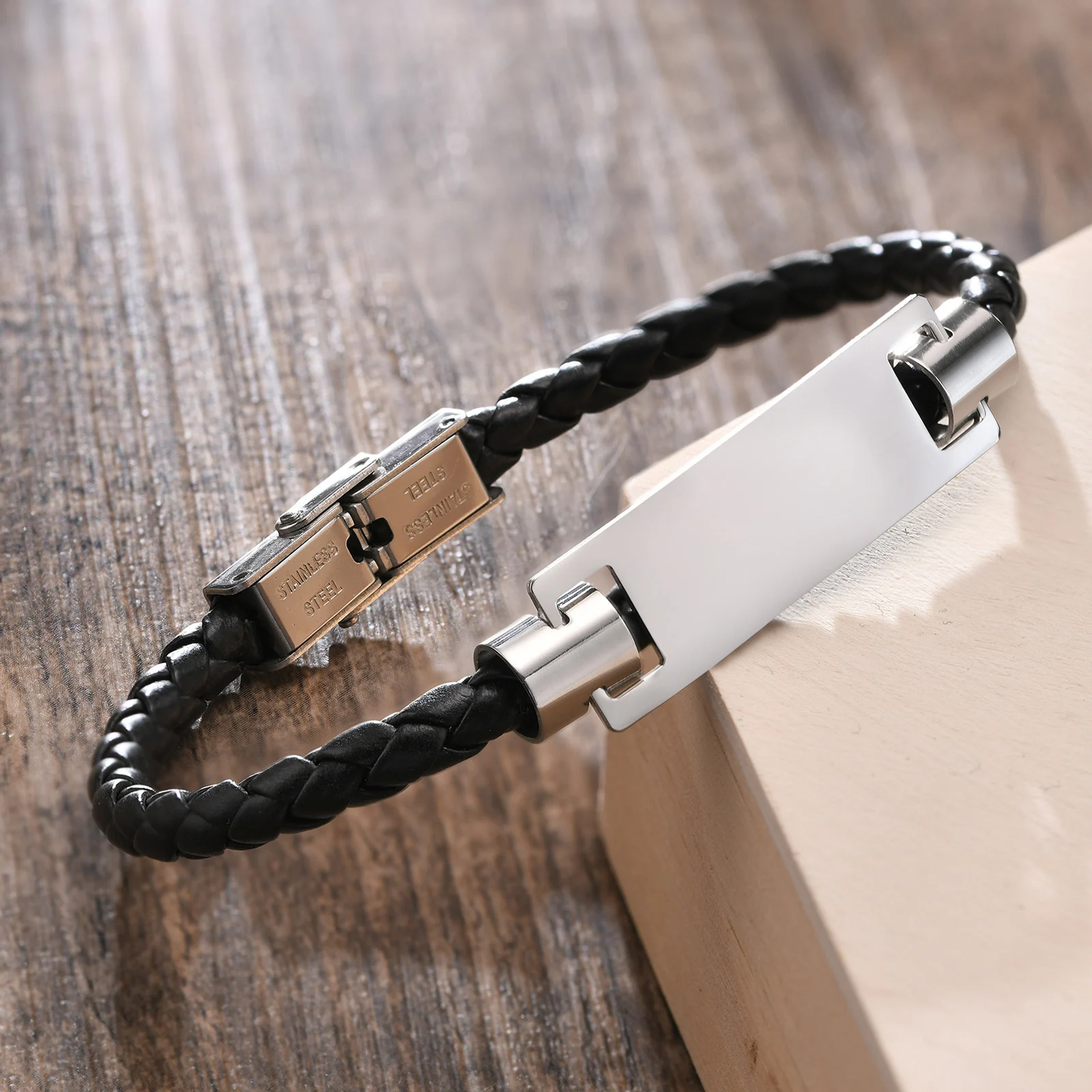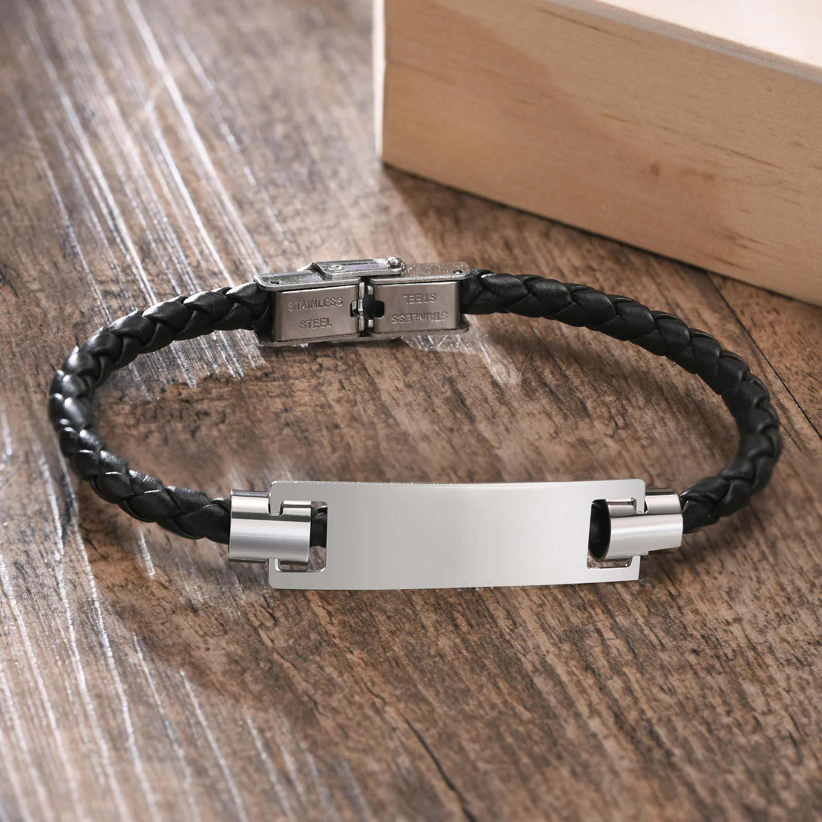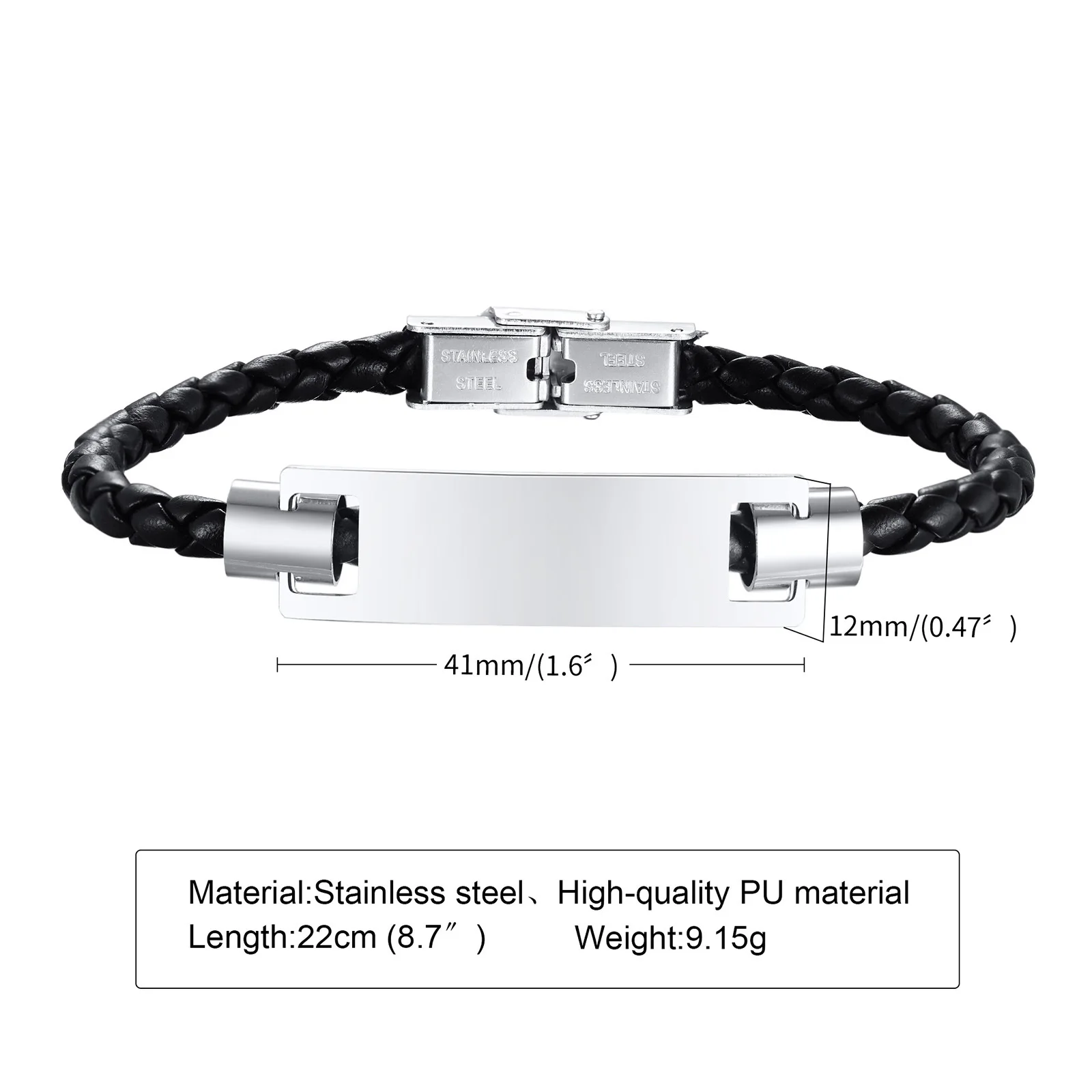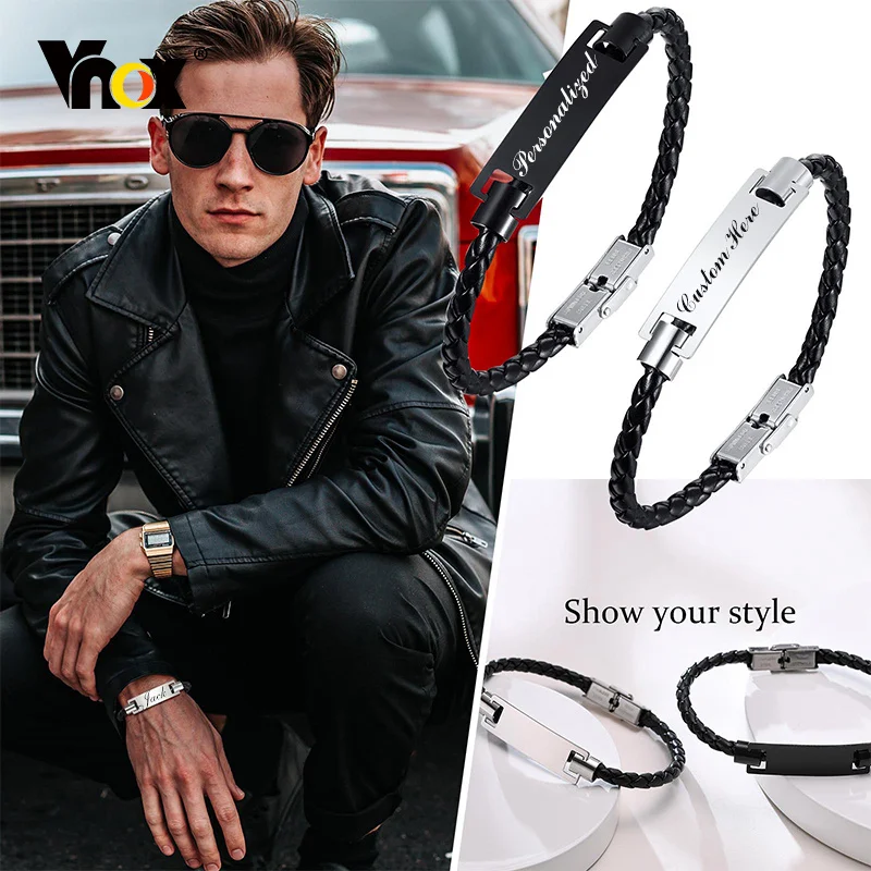 Мужской кожаный браслет Vnox с гравировкой на заказ, мужской браслет из нержавеющей стали с идентификационной биркой, повседневный плетеный кожаный веревочный браслет, мужской аксессуар