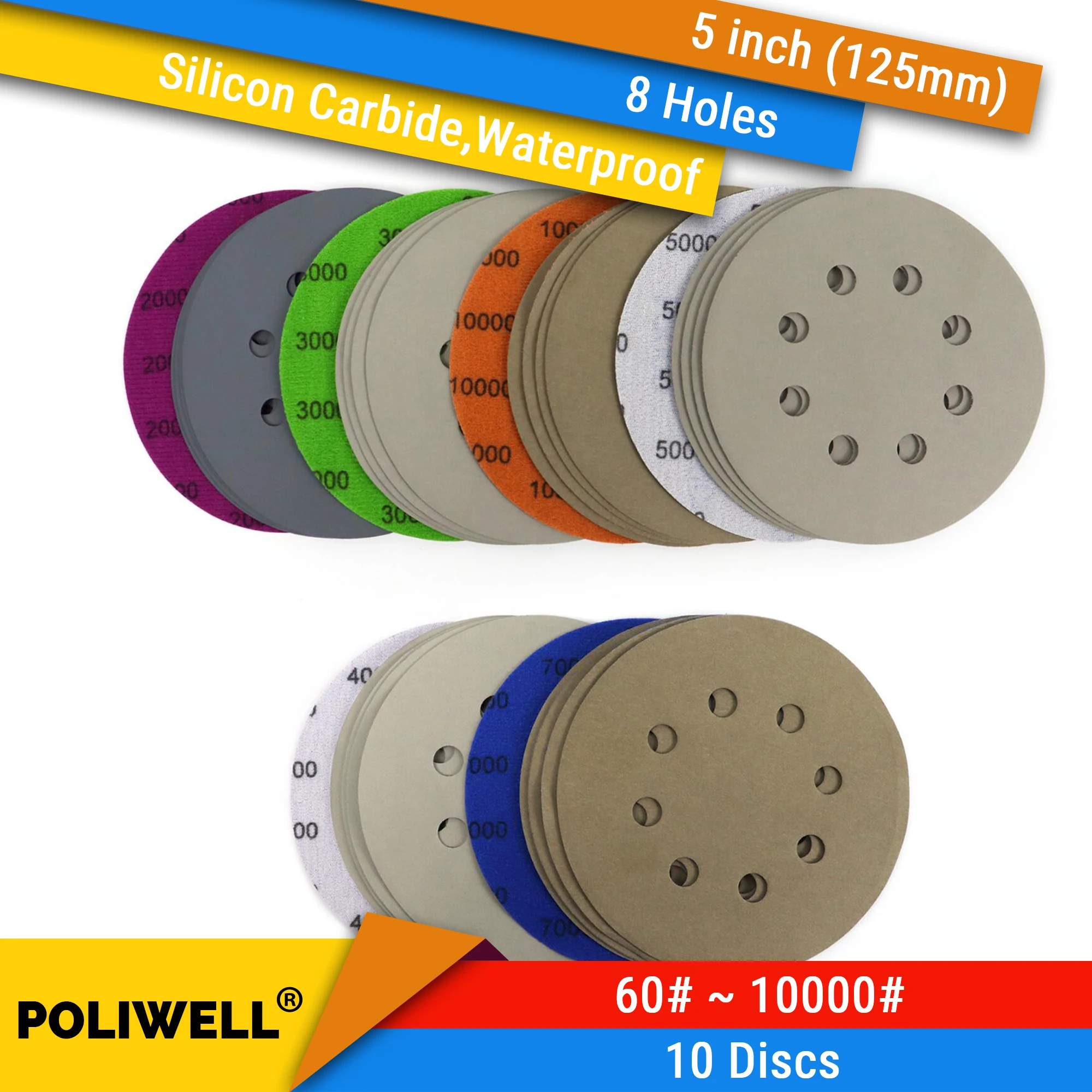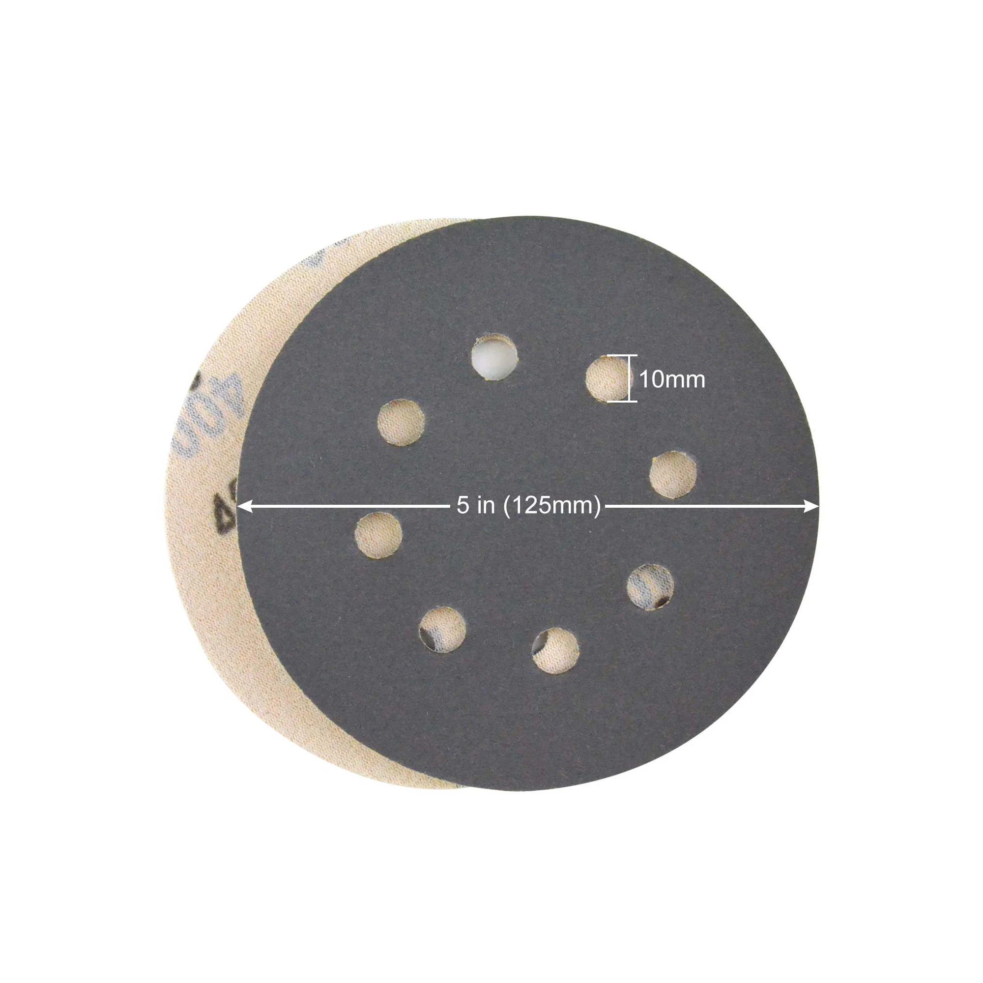 Название продукта:10 шт., 5 дюймов (125 мм), 8 отверстий, карбид кремния, крюк и петля, флокирование, водонепроницаемые шлифовальные диски для влажной/Сухой Шлифовки, круглая абразивная наждачная бумага