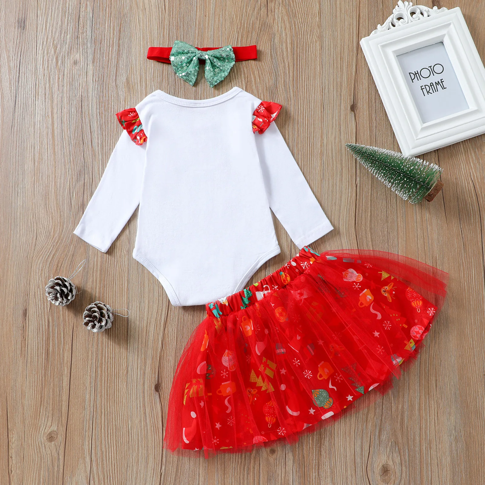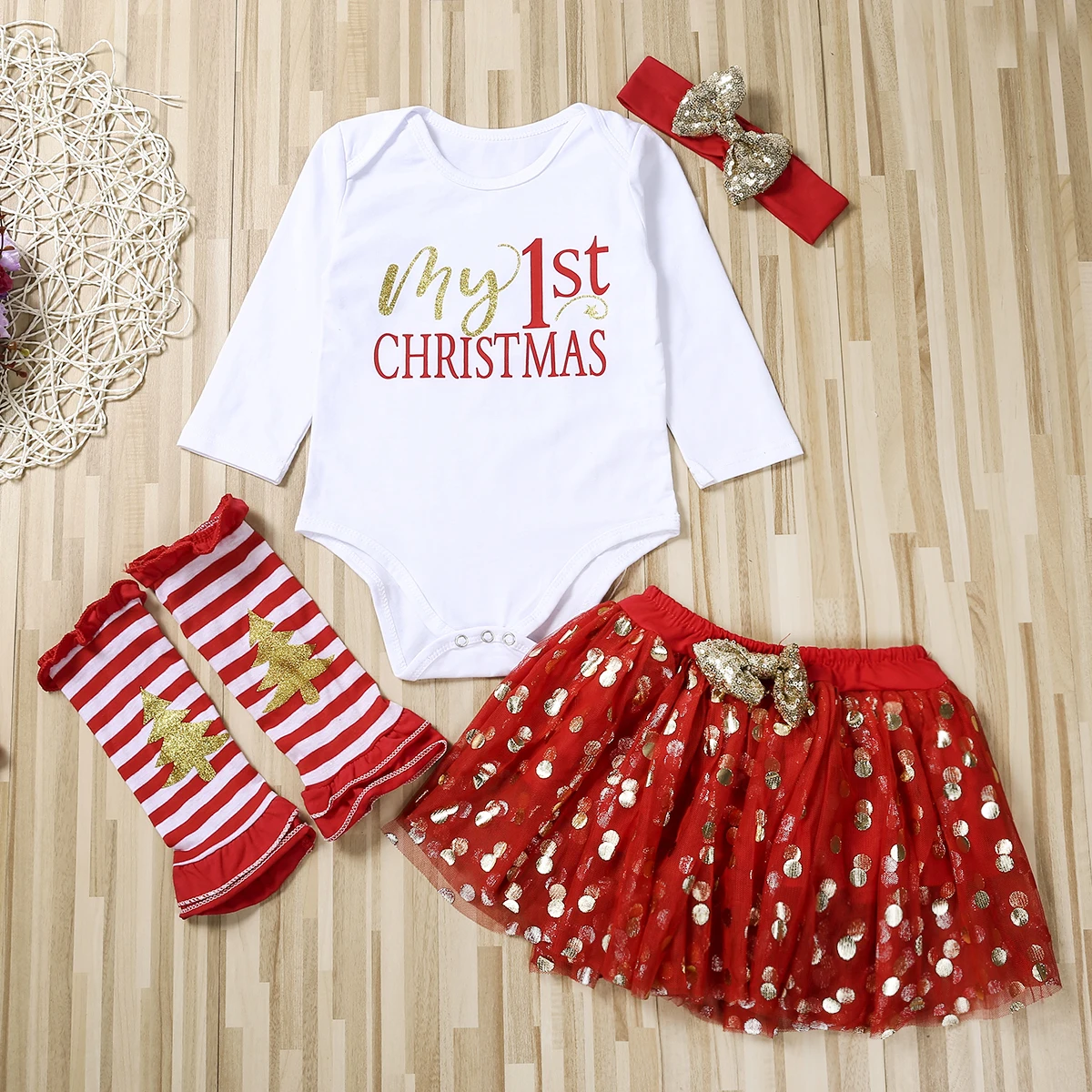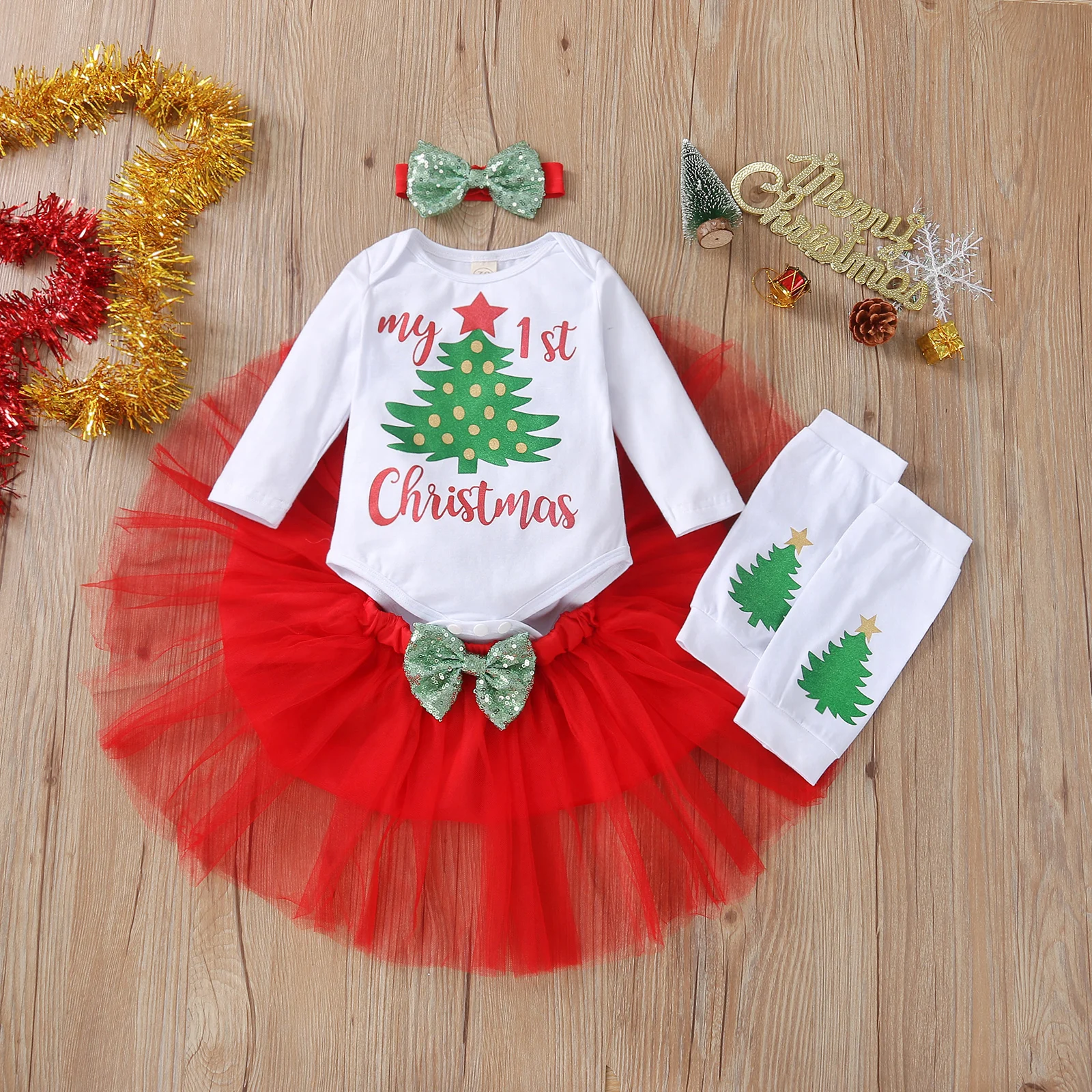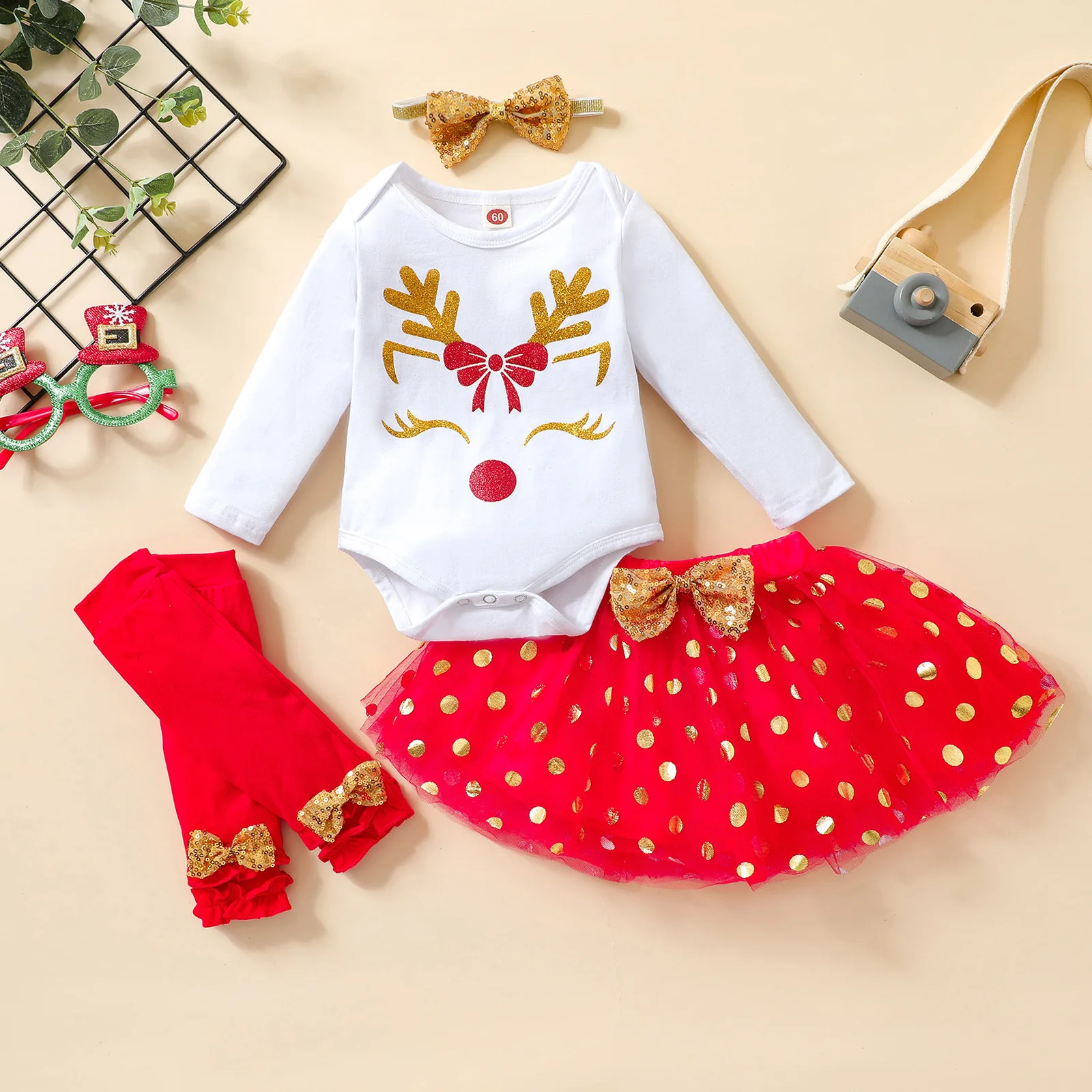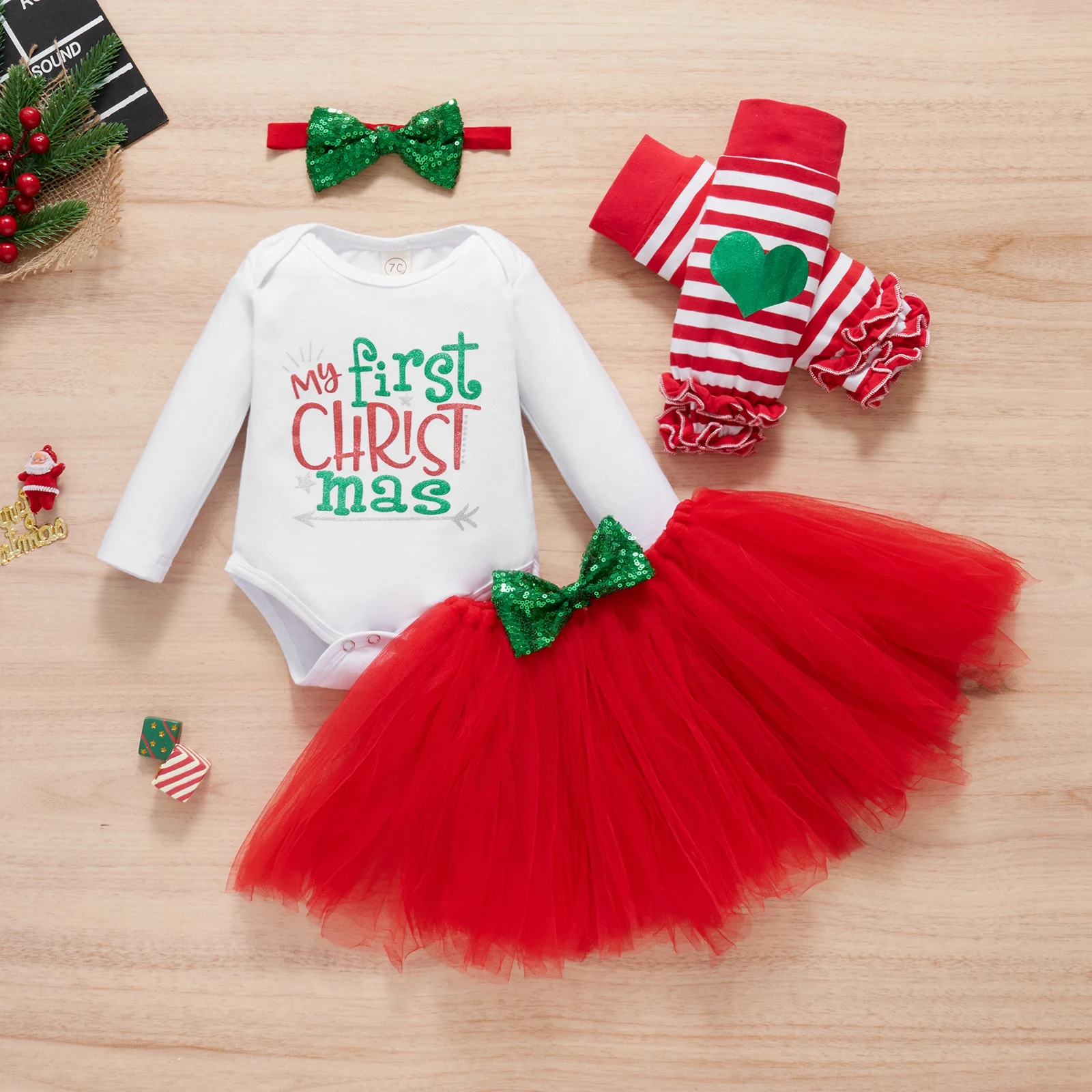 4 шт., новогодние комплекты для девочек, комбинезон с длинными рукавами и оленями, юбка-пачка, грелка для ног и повязка на голову
