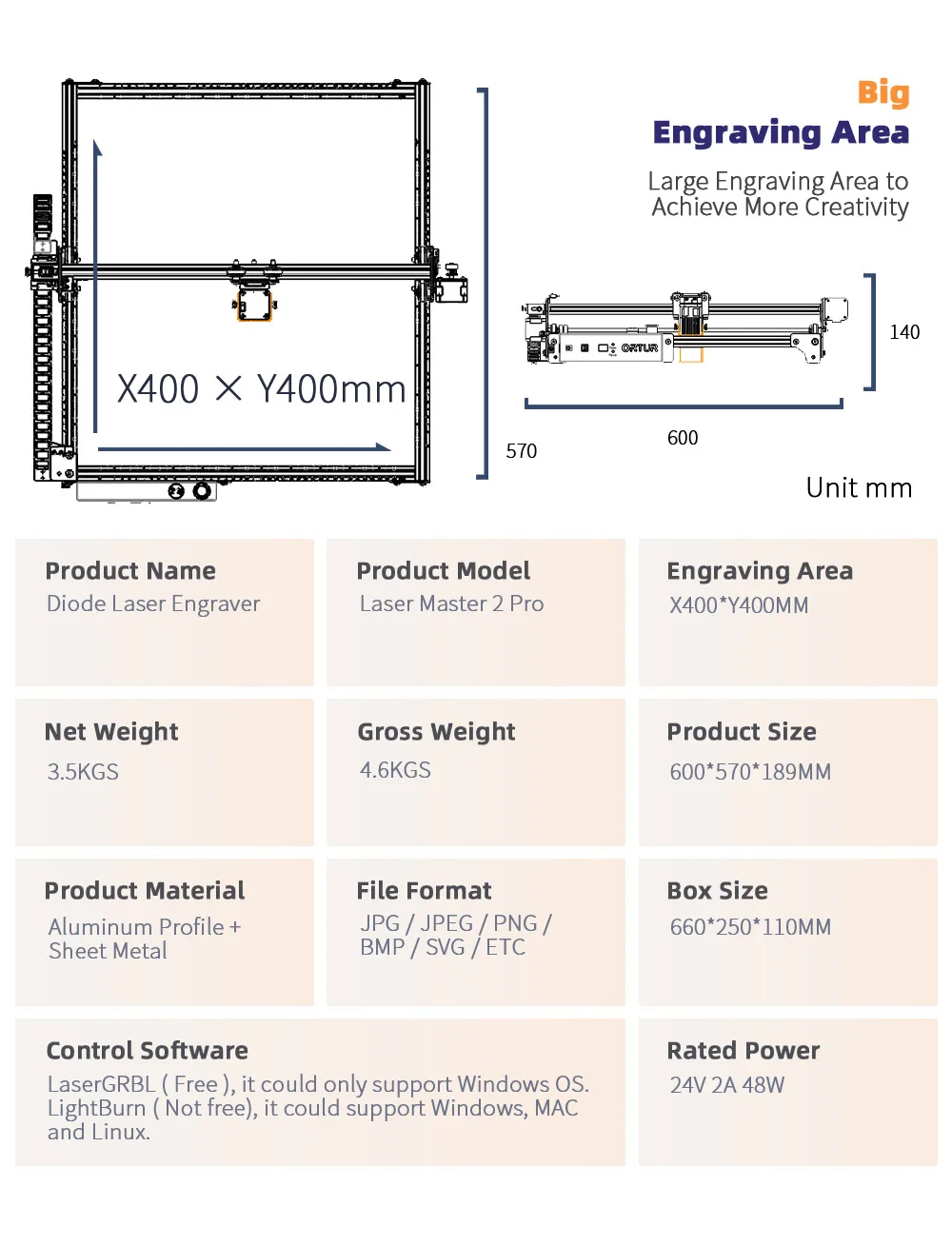 ● Детектор пламени●Защита активного положенияНа материнской плате есть g-сенсор, если машина обнаруживает неавторизованное движение, лазерный луч остановится.●Защита лазерного лучаЕсли ваша компьютерная система остановлена или USB кабель отключен, привело к тому, что лазерный гравер останавливает движение, лазерный луч остановится, чтобы предотвратить пожар.●Обнаружение и ограничение длительности экспозицииЕсли лазерный гравер находится под контролем, но пользователи забывают работать и поддерживать работу лазерного луча, дополнительная безопасность отключится, чехол остановит движение двигателя, чтобы предотвратить пожар.● LaserGRBL (бесплатное программное обеспечение) поддерживает Windows XP, 7, 8, 10. LaserGRBL является самым популярным программным обеспечением для резьбы в мире, может импортировать различные форматы изображений, вы можете редактировать в PhotoShop, Inkscape, CAD и т. Д., а затем подключаться к граверу с помощью лазерного LaserGRBL для гравировки и резки.● LightBurn (Платное программное обеспечение, lightburnsoftware.com) поддерживает Windows, Mac OS и Linux. Это самое популярное Платное программное обеспечение для резьбы в мире, очень простое в использовании.● Этот лазерный гравер поддерживает режим PWM.● Предварительно собранные детали, просто нужно 10 - 20 минут для установки машины.● Большая площадь гравировки 400x400 мм● Структура алюминиевой крышки, плавная работа, привлекательный внешний видПримечание:● Пожалуйста, носите очки при работе с лазерным гравером. Надевайте защитные очки, чтобы избежать слепоты.● Пожалуйста, не прикасайтесь к лазерному излучателю рукой, иначе он может сжечь вашу руку.● Пожалуйста, избегайте сильного воздействия на машину.● Детям до 14 лет не разрешается использовать этот продукт, и детям старше 14 лет требуется наблюдение за взрослыми.● Гравировальный светильник не может быть непосредственно применен к любому зеркальному отражающему объекту, что может привести к травме оператора или сжечь лазер.● Этот продукт не рекомендуется для промышленной резки из-за высокой скорости гравировки.Совет: поскольку программное обеспечение постоянно обновляется и оптимизируется, пожалуйстаНажмите здесьДля просмотра обновлений.
