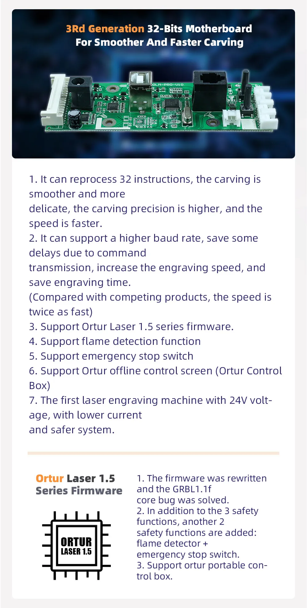 Основные характеристики:●Специализированная материнская плата с 32bit MCUОн может обрабатывать 32 инструкции, поддерживать скорость передачи данных до 921600, более мощный!●Самые передовые 32 бит лазерный гравер прошивкаOrtur laser master прошивка, умнее, быстрее, более высокая точность и проще в использовании.● Диапазон мощности лазера может быть S0 - S1000, по сравнению с 8 битами настольных лазерных гравировальных станков, которые имеют только S0 - S255, Ortur лазерный мастер может контролировать лазерный луч более точно, может даже использовать лазерное устройство высокой мощности, чтобы «нарисовать» изображение на бумаге, О том, что 8 бит высокой мощности лазерные гравировальные инструменты не смог нажать на кнопку.● Скорость гравировки может достигать 10000 мм/мин. (Это может сэкономить половину времени гравировки, чем аналогичные Гравировальные Машины хобби)