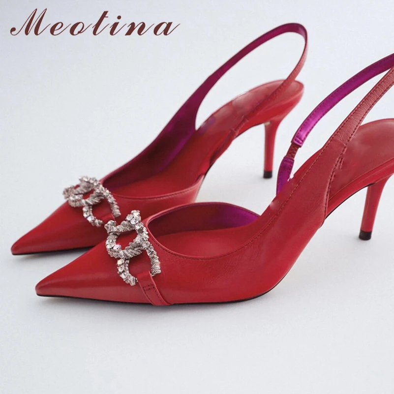 Туфли Meotina женские с ремешком на пятке, заостренный носок, тонкий высокий каблук, туфли-лодочки с кристаллами, Элегантная стильная летняя обувь, красные, 35-41