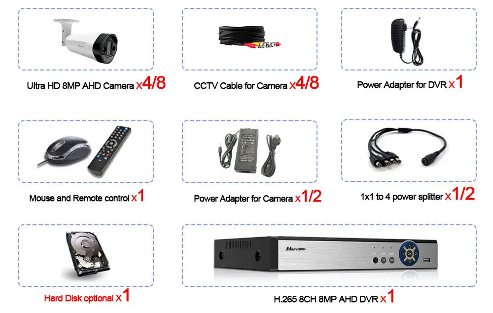 Цифровой видеорегистратор 8 каналов H.265 4K 6 в 14/8 x HD 8.0MP Крытый Открытый ИК День ночного видения камеры;4/8x65 футов (20 м) cctv видео кабель для камеры1/2 x адаптер питания для камерКабель-Сплиттер 1/2X1-41 х адаптер питания для DVR;1 X USB мышь для DVR;1 компакт-диск программного обеспечения для DVR;1 пульт дистанционного управления для DVR;Жесткий диск опционально!