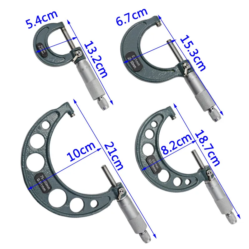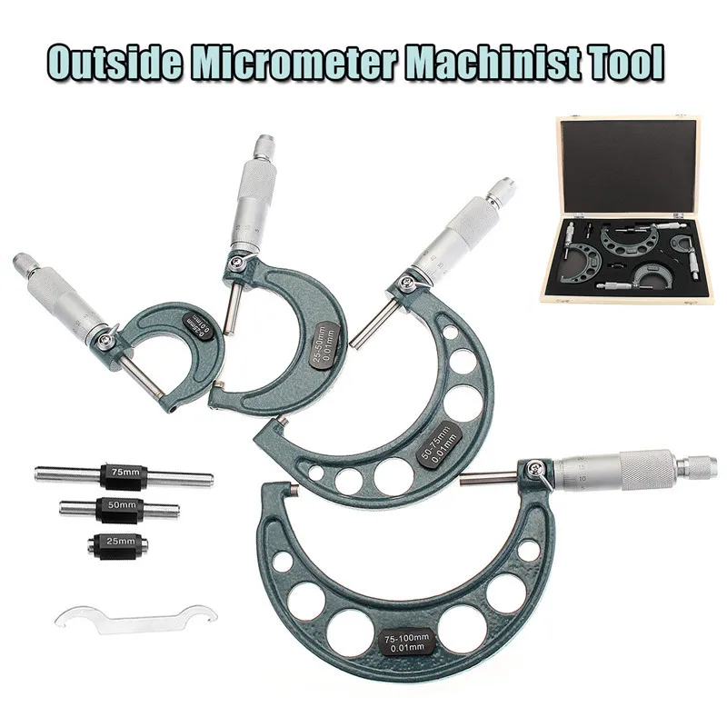 Детали:* 100% новый и высокое качество* 0-4 "x 0,0001" точность наружный диаметр микрометра группы.* Включая 4 мкм, диапазон измерения: 0-1 ", 1-2", 2-3 ", 3-4"* Твердосплавная измерительная поверхность зонда* Храповик останавливается. Затяните гайку.* 4 стандарта.* Прочная литая рама.* 0-25 мм/50 мм/75 мм/100 мм/0,01 внешний диаметр микрометра, твердосплавная головка Метрическая резьба суппорт, 4 измерительный инструмент* Диапазон измерения 0-100 мм• Точность 0,01 ммПосылка включает в себя:1 * калибровочный стержень + 1 * микрометрНабор из 4 предметов (включая 4 микрометра + калибровочный стержень * 3 + гаечный ключ * 1)