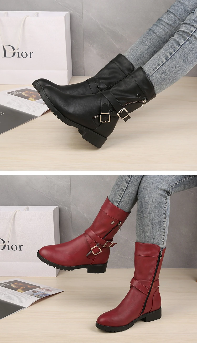 Женские ботинки до середины икры, кожаные ботинки на низком квадратном каблуке, на молнии, с пряжкой, красные, черные, серые, 2021