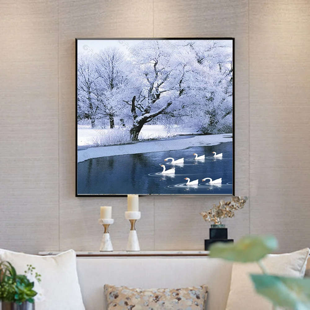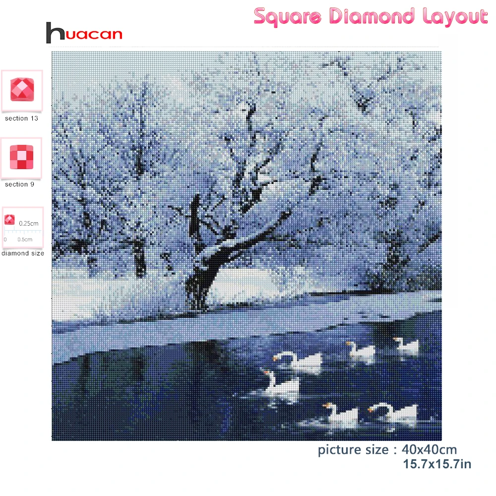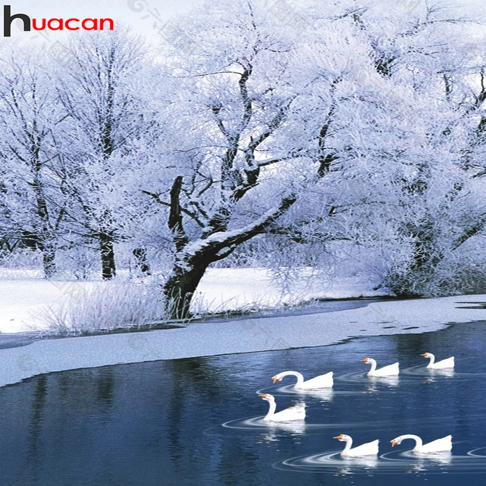 Алмазная 5d картина Huacan, полноразмерная мозаика с изображением снега, дерева, лебедя, зимнее украшение для дома