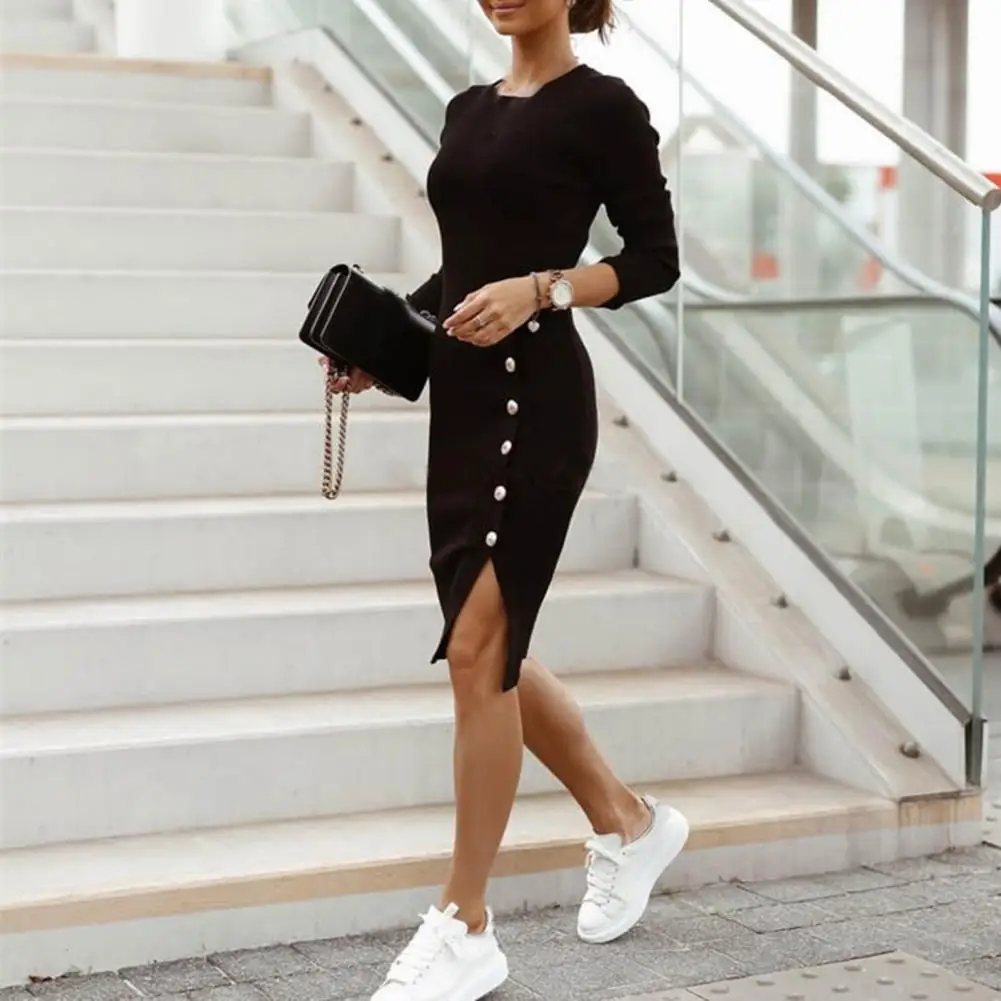 Вязаное платье сплошного цвета с разрезом по бокам, Осеннее сексуальное платье с круглым вырезом на пуговицах для офиса Описание: Дизайн с разрезом по бокам очень сексуальный, и это делает вас более темпераментным и изящным. Платье украшено изысканными пуговицами, что очень модно и привлекательно. Женское изящное и Очаровательное платье с круглым вырезом и длинным рукавом. Это платье изготовлено из высококачественного полиэфирного материала, оно мягкое и удобное в носке. Есть пять размеров: M, L, XL, 2XL, 3XL. Однотонное трикотажное платье подходит для повседневной носки, офиса, свиданий, вечерние и т. Д. Наименование товара: платье Материал: полиэстер Стиль: Модный Тип Посадки: тонкий Пол: женщин Тип размера: Обычный Тип воротника: круглый вырез Сезон: Осень, Зима Длина платья: мини-платье Длина рукава: длинный рукав Особенности: мягкий, однотонный, вязаный Информация о размере: Размер: M, обхват груди: 88 см/34,6 ", рукав: 56 см/22", длина: 90 см/35,4 "(прибл.) Размер: L, обхват груди: 92 см/36,2 дюйма, рукав: 57 см/22,4 дюйма, длина: 91 см/35,8 дюйма (прибл.) Размер: XL, обхват груди: 96 см/37,8 дюйма, рукав: 58 см/22,8 дюйма, длина: 92 см/36,2 дюйма (прибл.) Размер: 2XL, обхват груди: 100 см/39,4 дюйма, рукав: 59 см/23,2 дюйма, длина: 93 см/36,6 дюйма (прибл.) Размер: 3XL, обхват груди: 104 см/40,9 ", рукав: 60 см/23,6", длина: 94 см/37 "(прибл.) Примечания: Пожалуйста, обратитесь к нашей таблице размеров и выберите правильный размер. Благодаря светильник и экрана Цвет Товара может быть s светильник ly отличается из-за характеристик монитора компьютера. Посылка включает в себя: 1 платье