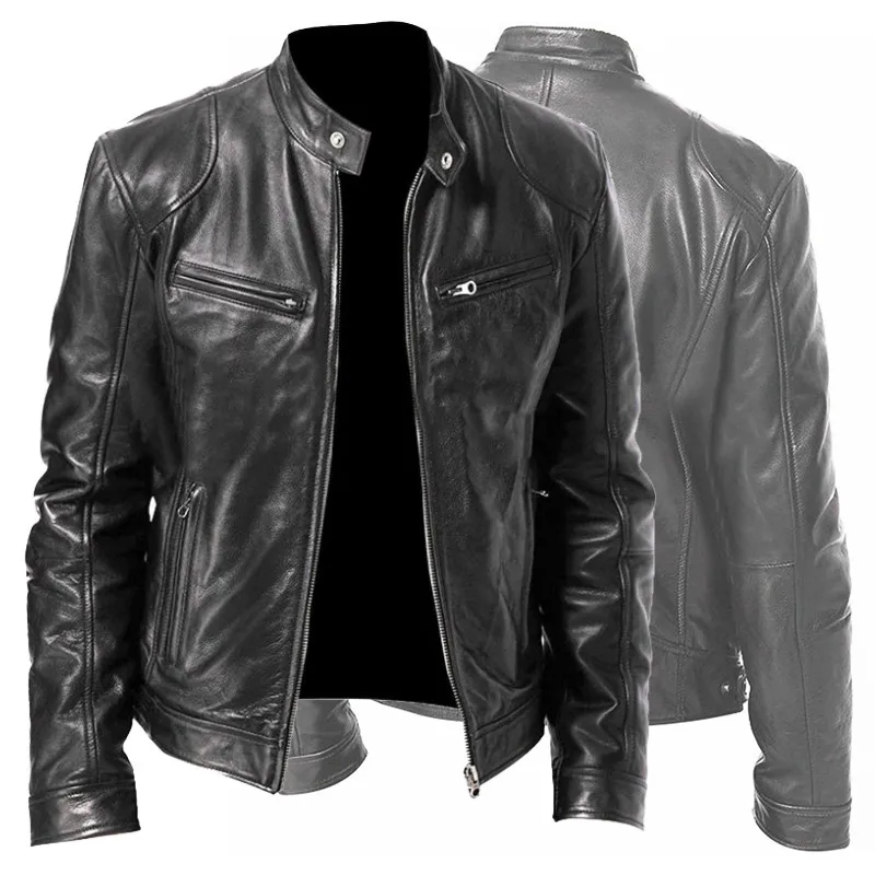 Мужская кожаная винтажная куртка на молнии, с воротником-стойкой