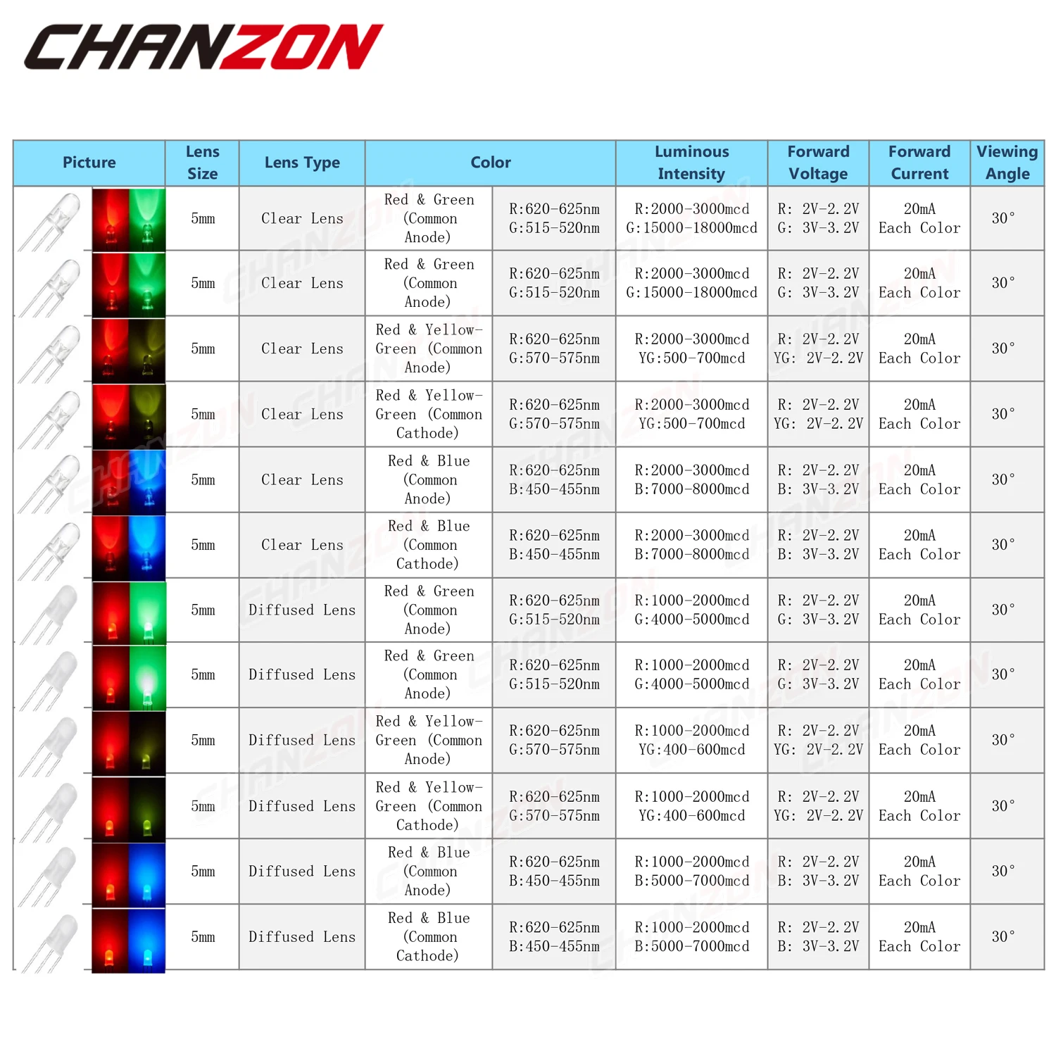 Бренд: CHANZON Количество: 100 шт./упак. Линзы: прозрачные линзы/матовые линзы Цвет излучения: красный и зеленыйБиколор | Красный и желто-зеленый биколор |Красный и синий биколорУгол обзора: 30 градусов (прозрачные линзы) | 20 градусов (матовые линзы) Переднее напряжение/ток: R/YG: 2V-2,2 V B:3V-3,2 V | 20mA (каждого цвета) Полярность: общий анод/общий катод