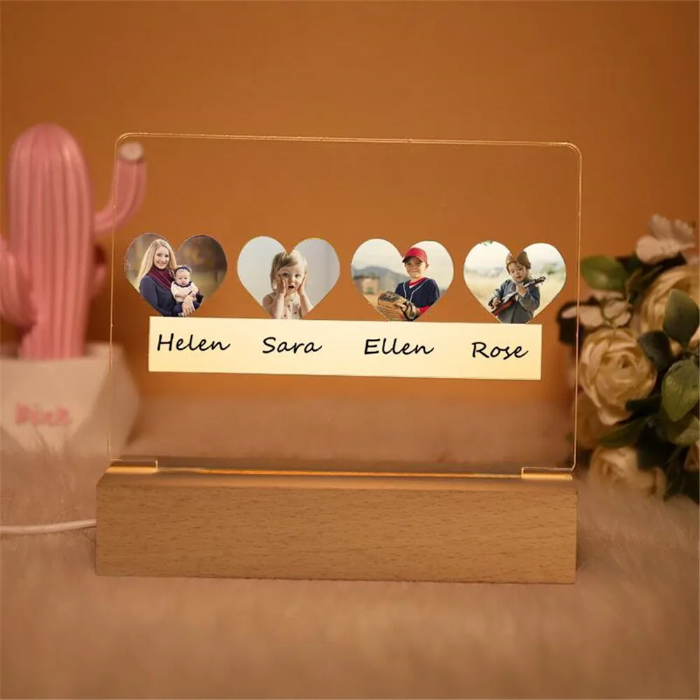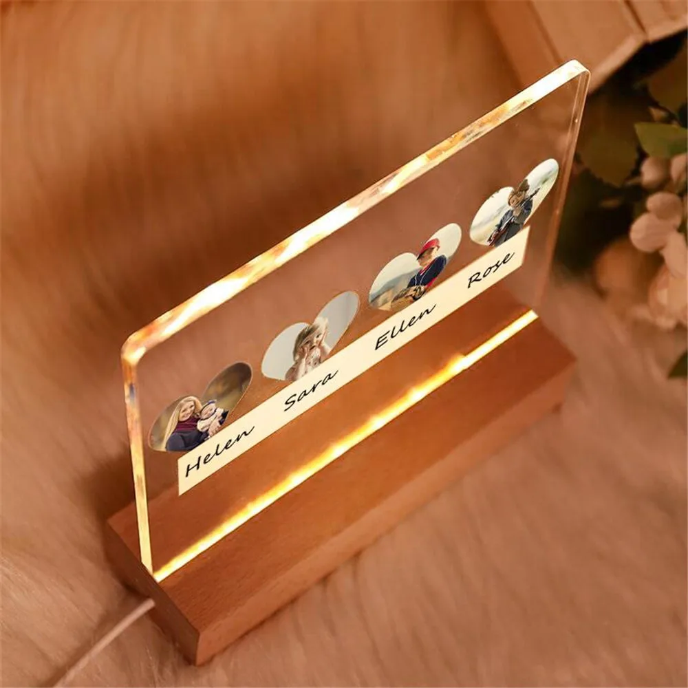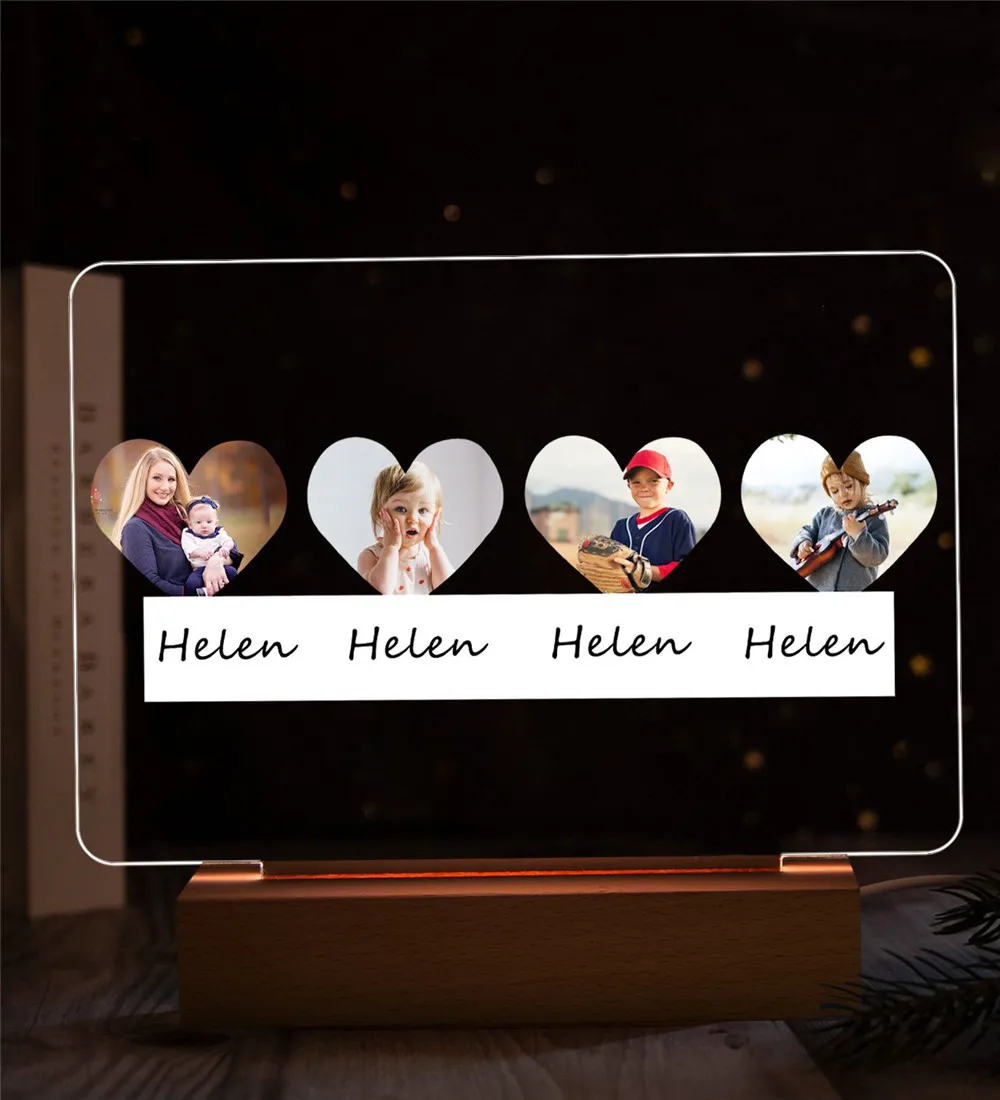 Персонализированный светодиодный ночник с USB, акриловая 3D лампа с 4 фото и именем под заказ для спальни, гостиной, украшение для дома с деревянной основой