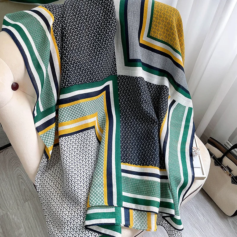Шарф из хлопка и льна с геометрическим принтом, женский теплый шарф, шаль, длинное пляжное полотенце.