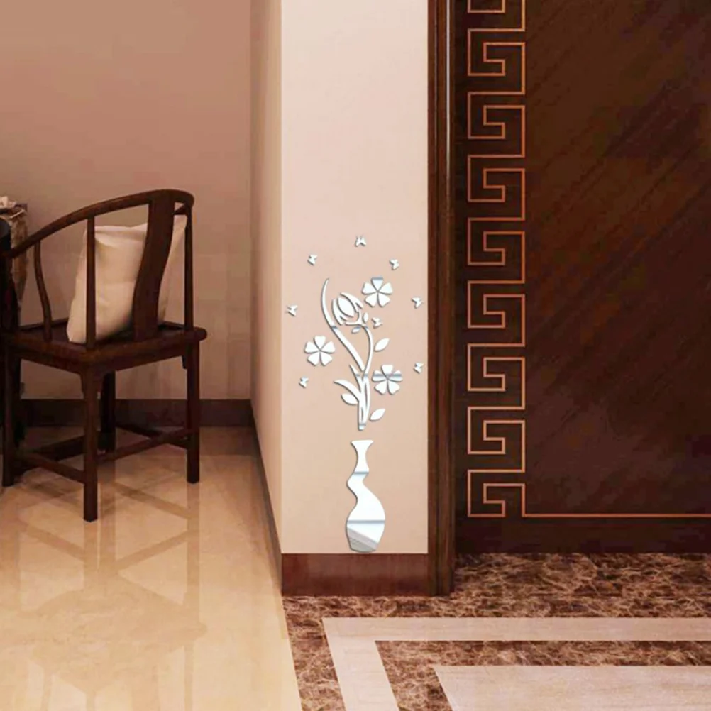 3D акриловая Наклейка на стену, Зеркальная Наклейка с цветами и вазой, экологичные наклейки на стену для спальни, гостиной, ванной комнаты, украшение (Silv