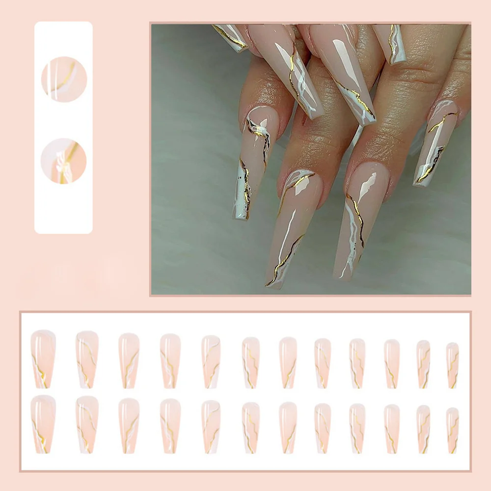 24 шт.кор. мраморные длинные гвозди, накладные ногти с золотой линией, дизайн балерины, маникюрные пластыри, накладные ногти, съемные накладные ногти
