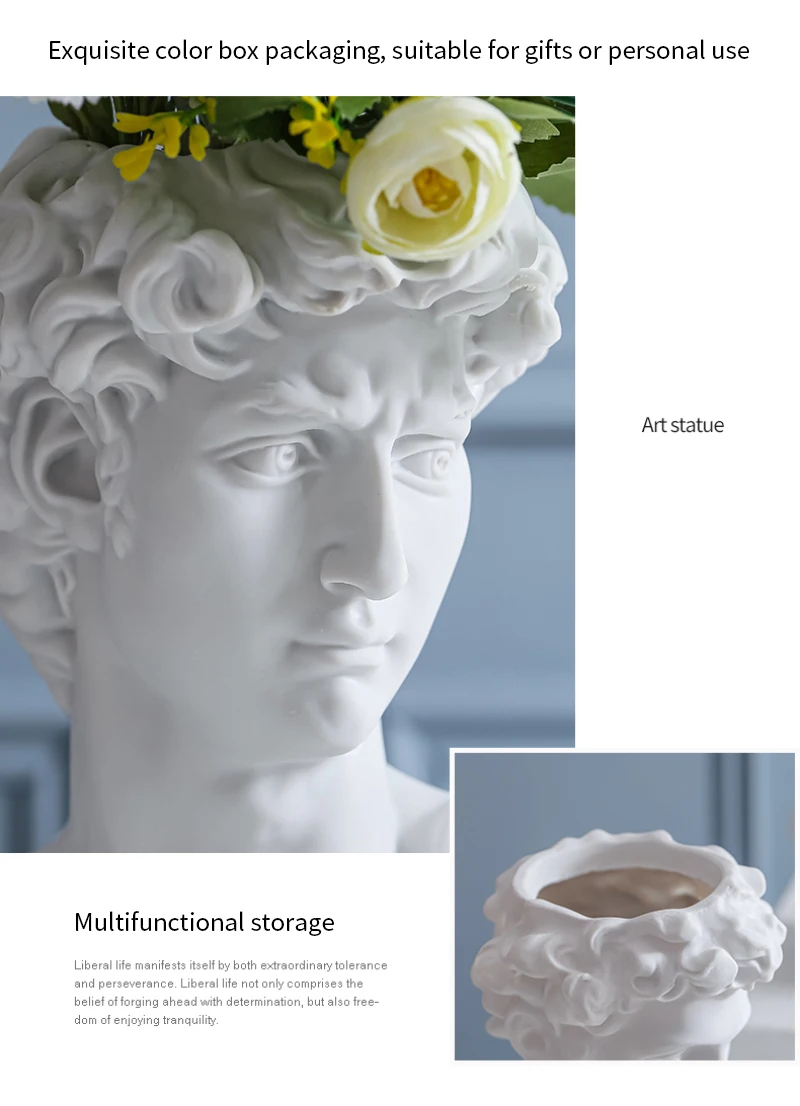 2. Многократное использование: Эта уникальная статуя Давида бюста, подставка для кистей для макияжа, может держать ваши кисти для макияжа, подводку для глаз, тушь для ресниц и аксессуары. Его также можно использовать как вазу, держатель ручки, суккулентный плантатор, комнатный/открытый плантатор, и украсить ваш обеденный стол, ванную комнату, столешницу и офис.